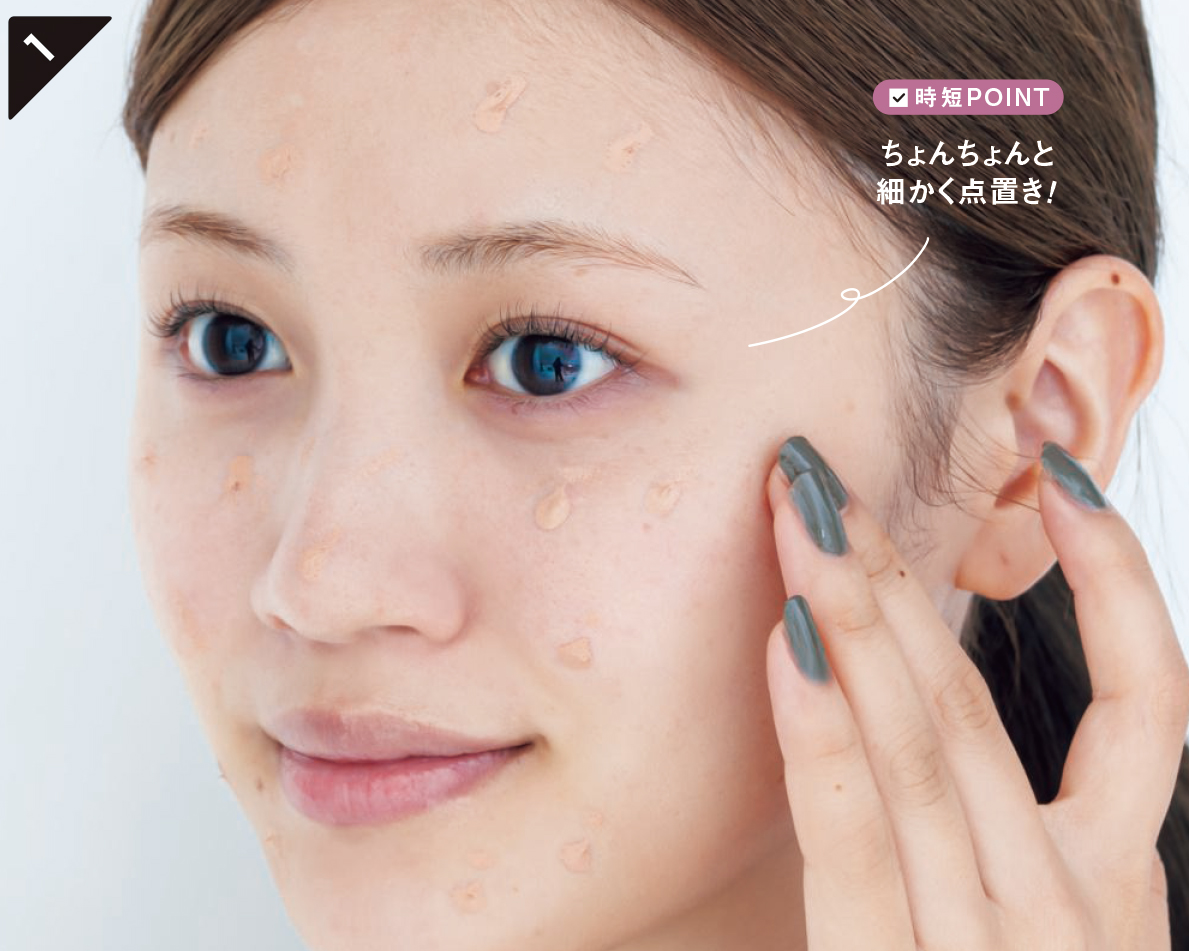 時短できれいな肌に見せるためには、薄膜で粗をカバーするのカギ! 日焼け止め・下地・ファンデが一体化した、多機能BBクリームさえあればOK。さっと塗るだけで気になる肌悩みをカバーし、今っぽいナチュラルなツヤ感ベースが作れます。