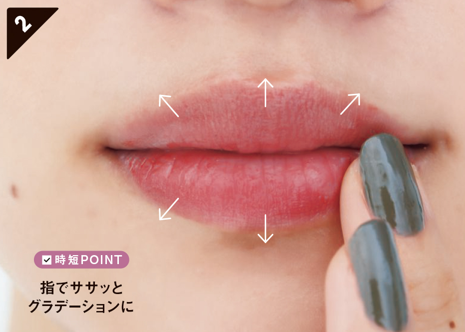 内側に塗ったマルチカラーを外側に向かってのばしてぼかす。上唇は輪郭ややオーバーめにぼかし、人中短縮も狙って。