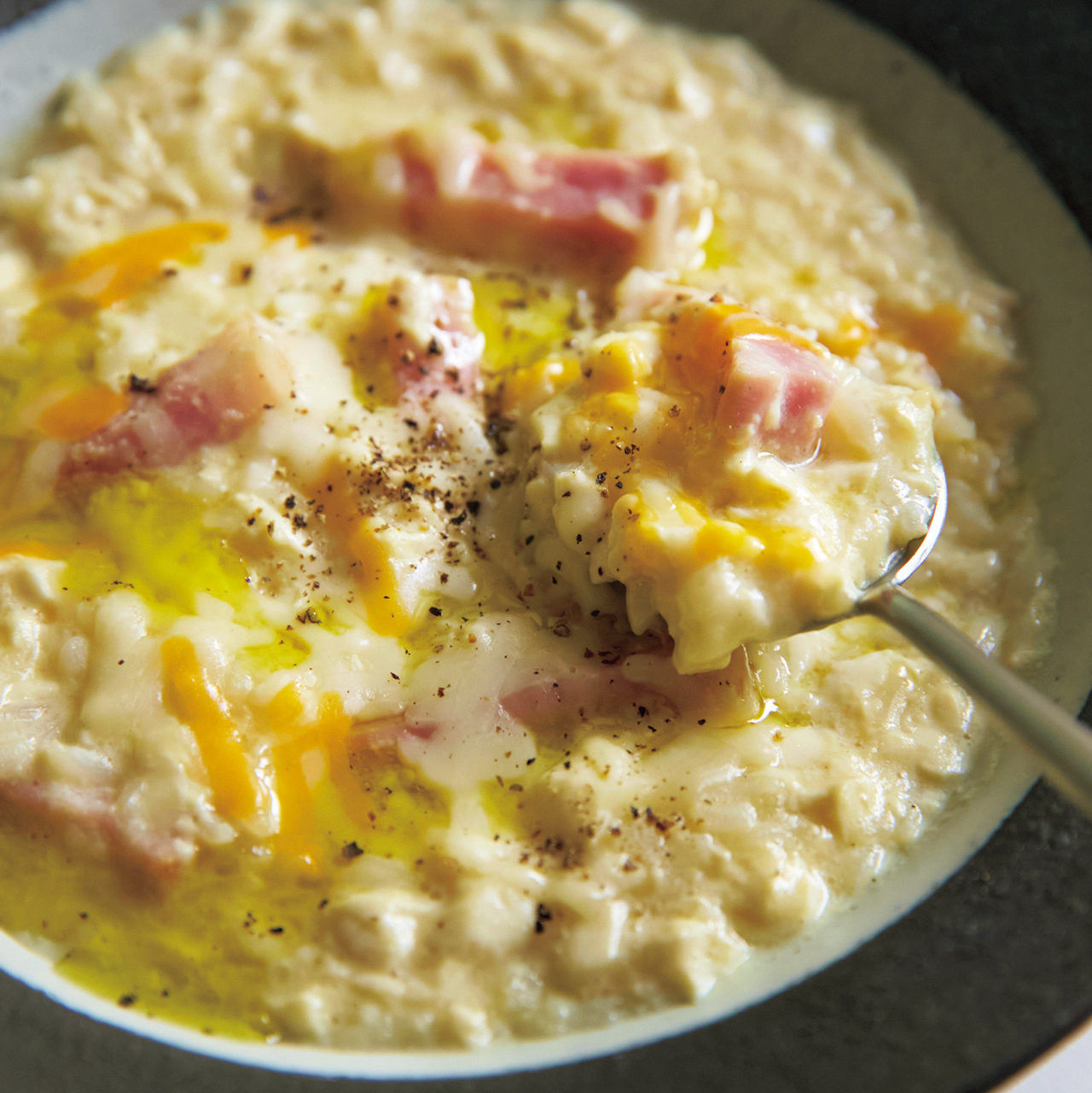 糖質が低い食材を組み合わせたリゾット。豆腐だけよりも、チーズやベーコン、少しごはんを入れると、満足感が断然違います!