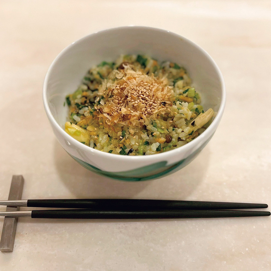 ①玄米ごはんをお茶碗によそい、香味ペースト、麺つゆを加えて混ぜ、ラップで包んで三角に握る。