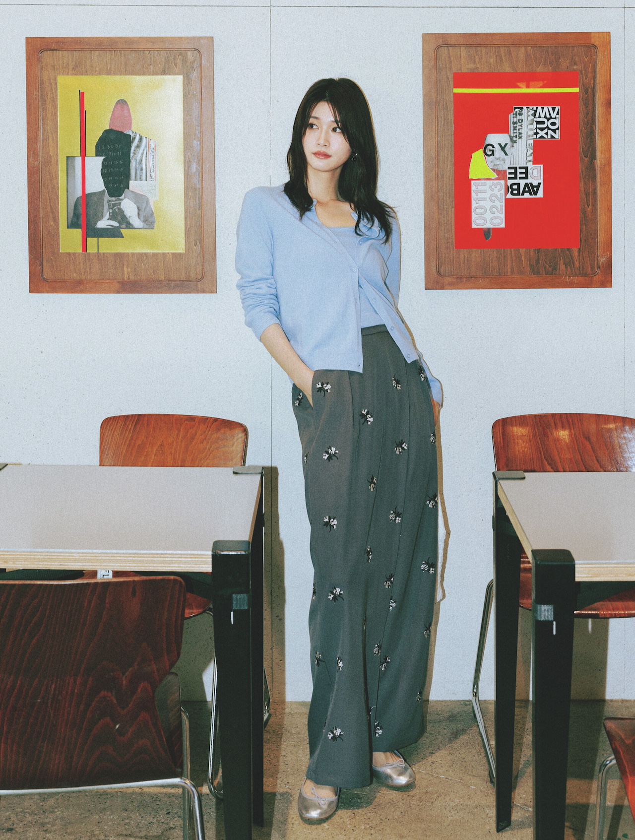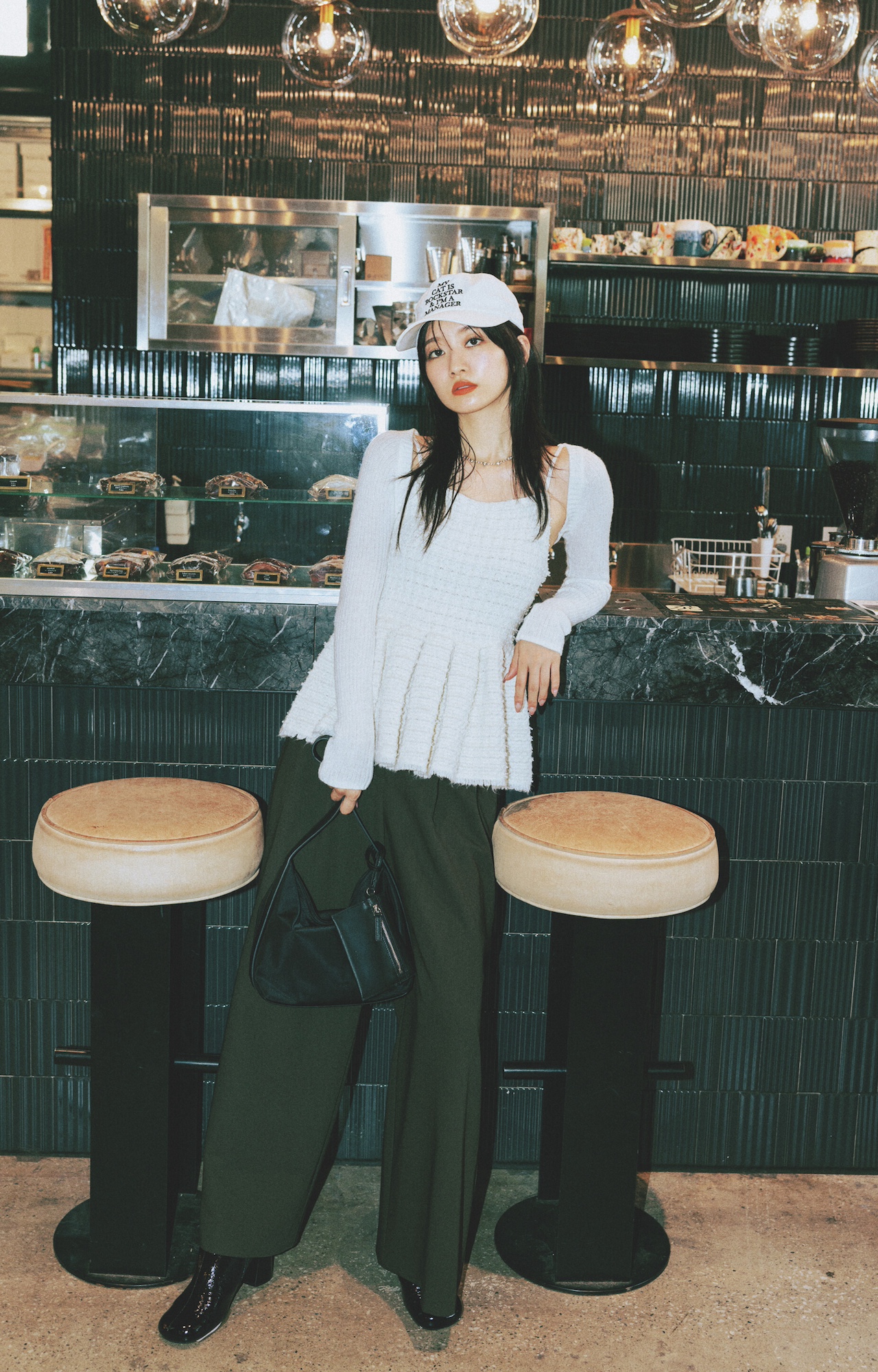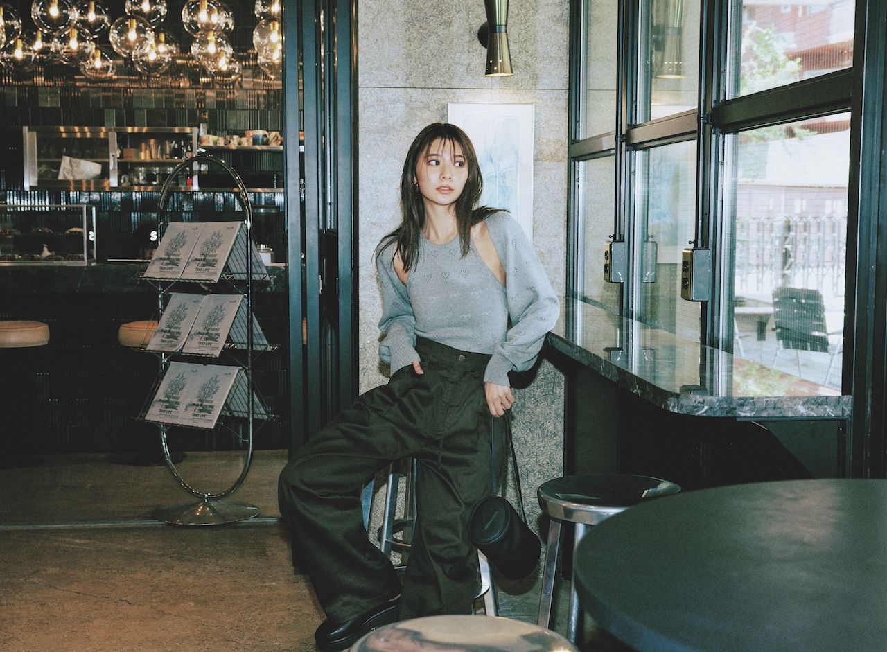 カーディガンとビスチェのセット¥31,900(カイタックインターナショナル<ヤヌーク>)、パンツ¥20,900(ゲストリスト<NEEDBY heritage>)、バッグ¥50,600(Al Design<MARY AL TERNA>)、靴¥29,700(TOKEN<リミット ティル トゥエンティスリー フィフティナイン>)、メガネ¥42,900(アイヴァン 東京ギャラリー<アイヴァン>)、イヤリング¥2,640(フィービィー)、リング¥42,900(フーブス<IRIS47>)