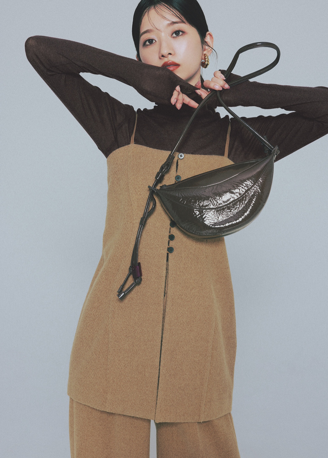 間違いなくかわいいブラウン×キャメルの組み合わせ♡ シアーなタートルにウールのセットアップ、光沢バッグで質感に差をつければ、同色の中にリズムが生まれてさらにこなれたスタイリングが叶う!