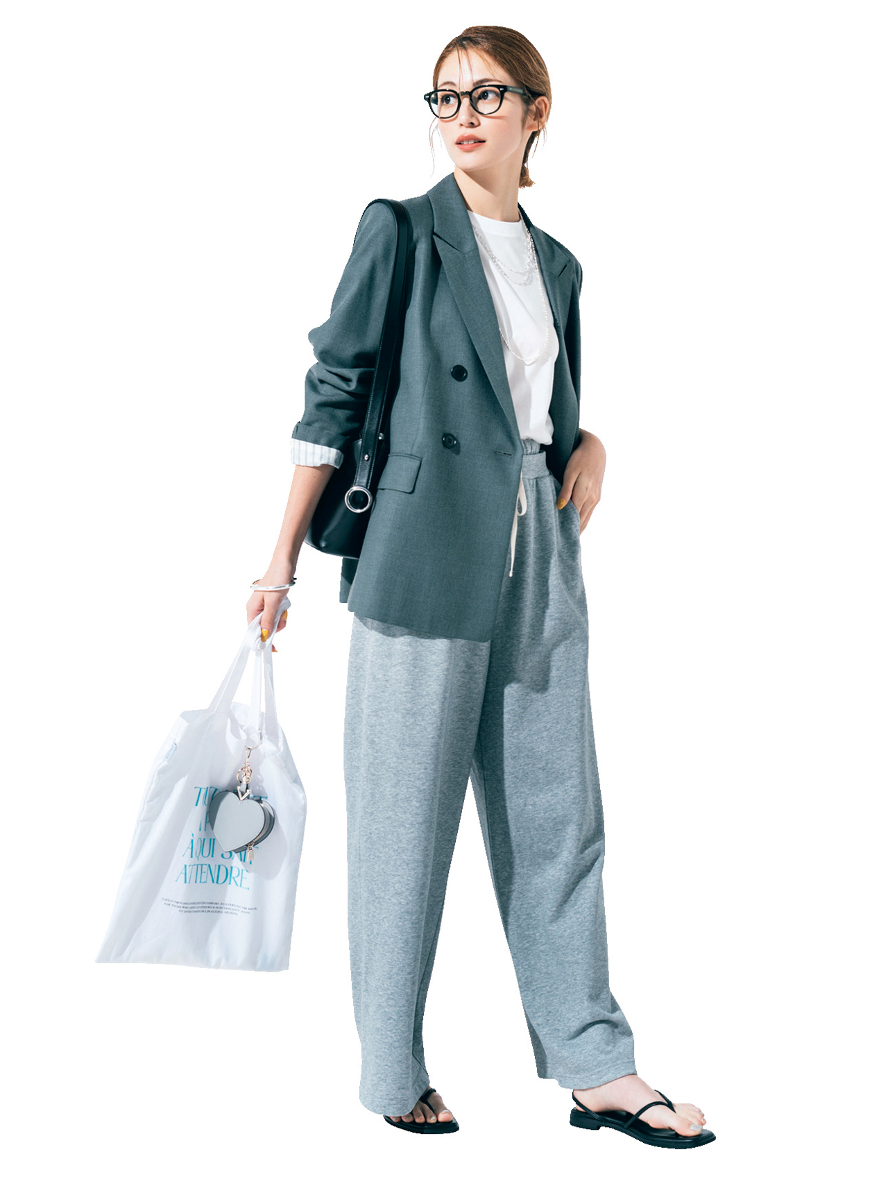 リラクシーなスエット×かっちりジャケットのギャップが、洒落見えに直結。清涼感のある白Tでバランスをとりつつ、洗練されたグレーワントーンで、大人見えを叶えて。