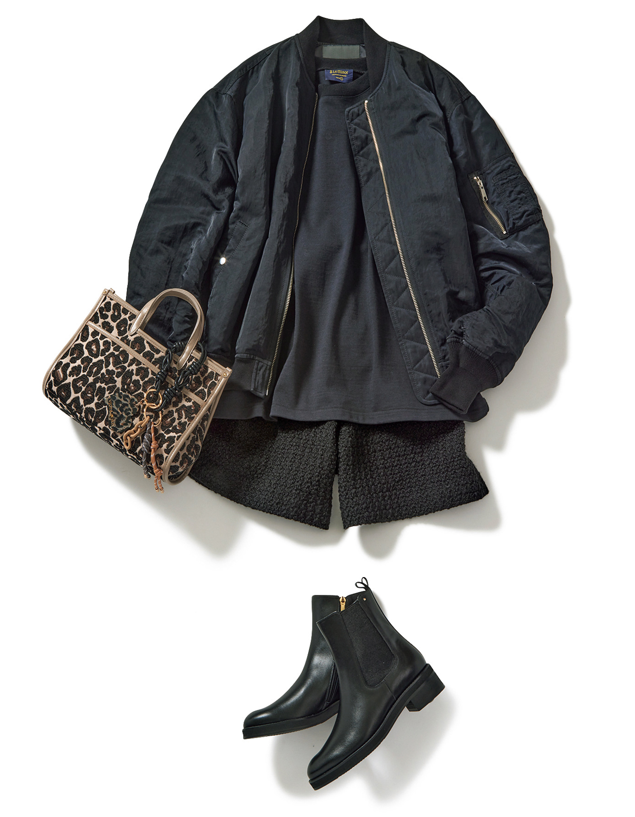 「オールブラックのコーデなら、やりすぎ感が出ず失敗も少ないのでレオパード小物にも挑戦しやすい!」