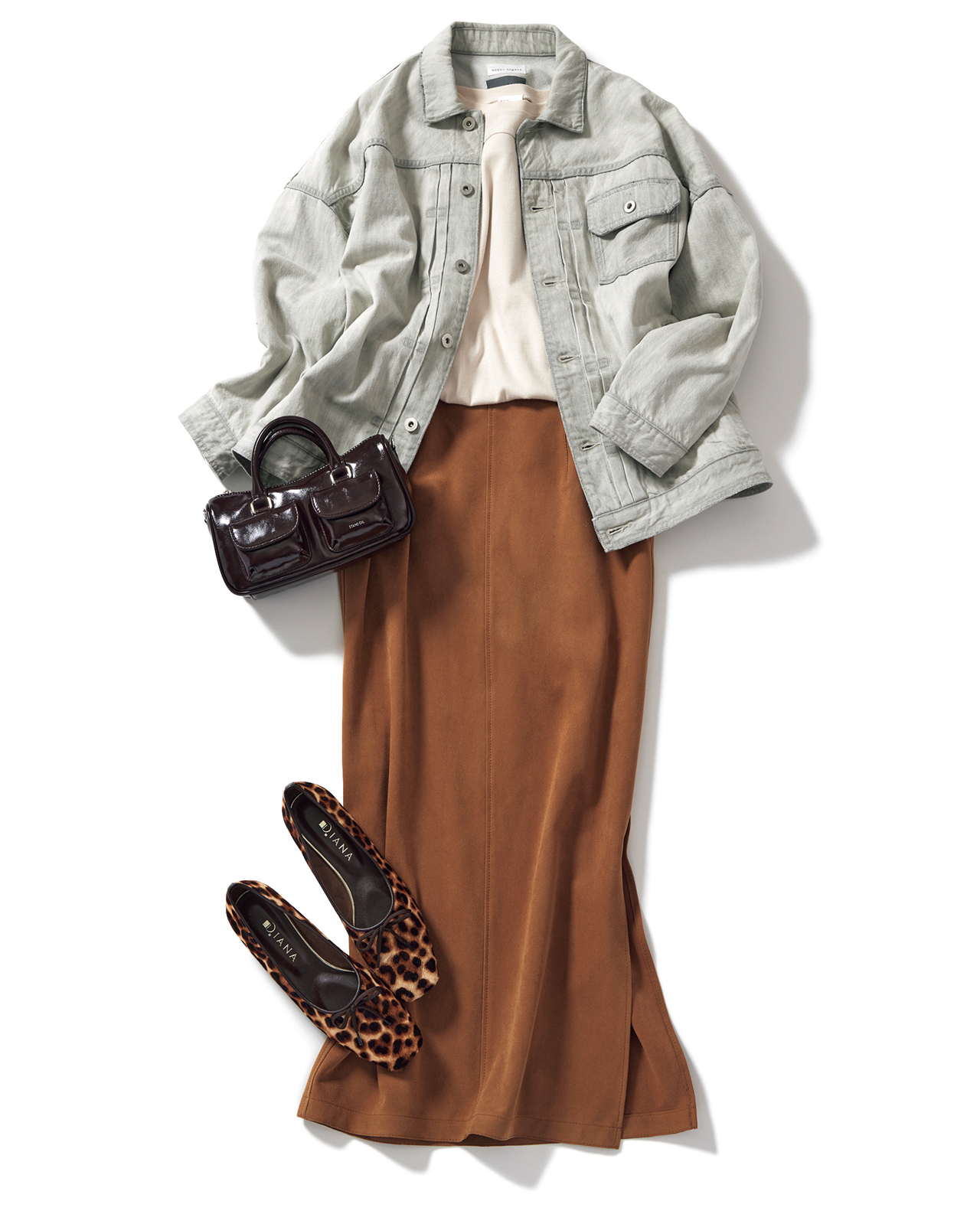 「柄のトーンに合わせて、スカートも赤っぽいブラウンで統一。それだけでレオパードがコーデに馴染み、腰から足元にかけてつながりができるので脚長効果も!」