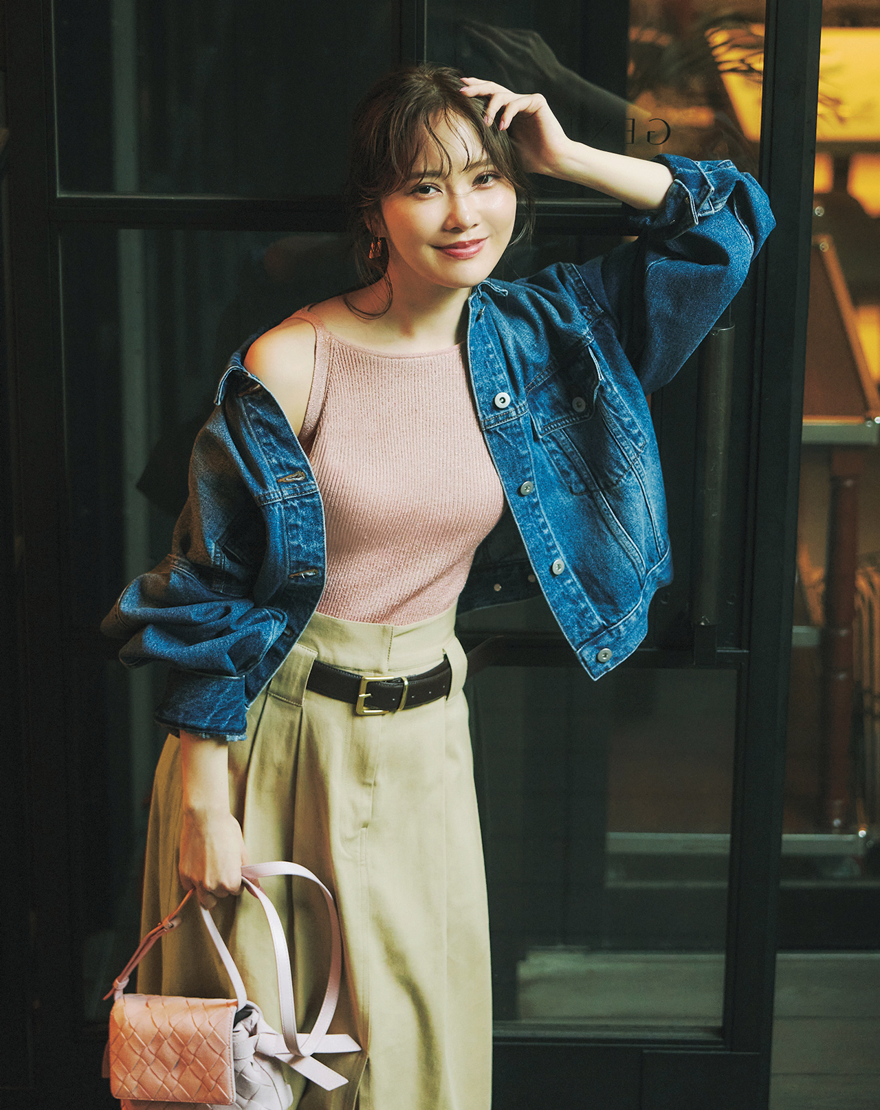 自然と縦ラインを強調するところも優秀なカップ付きリブニットは、ラメ糸混が映えポイント。背中の内側にも当て布が付いているので、1枚でも安心して着られる。Gジャン×チノスカートのカジュアルコーデこそ、肩出しが色っぽ見えのエッセンスに!