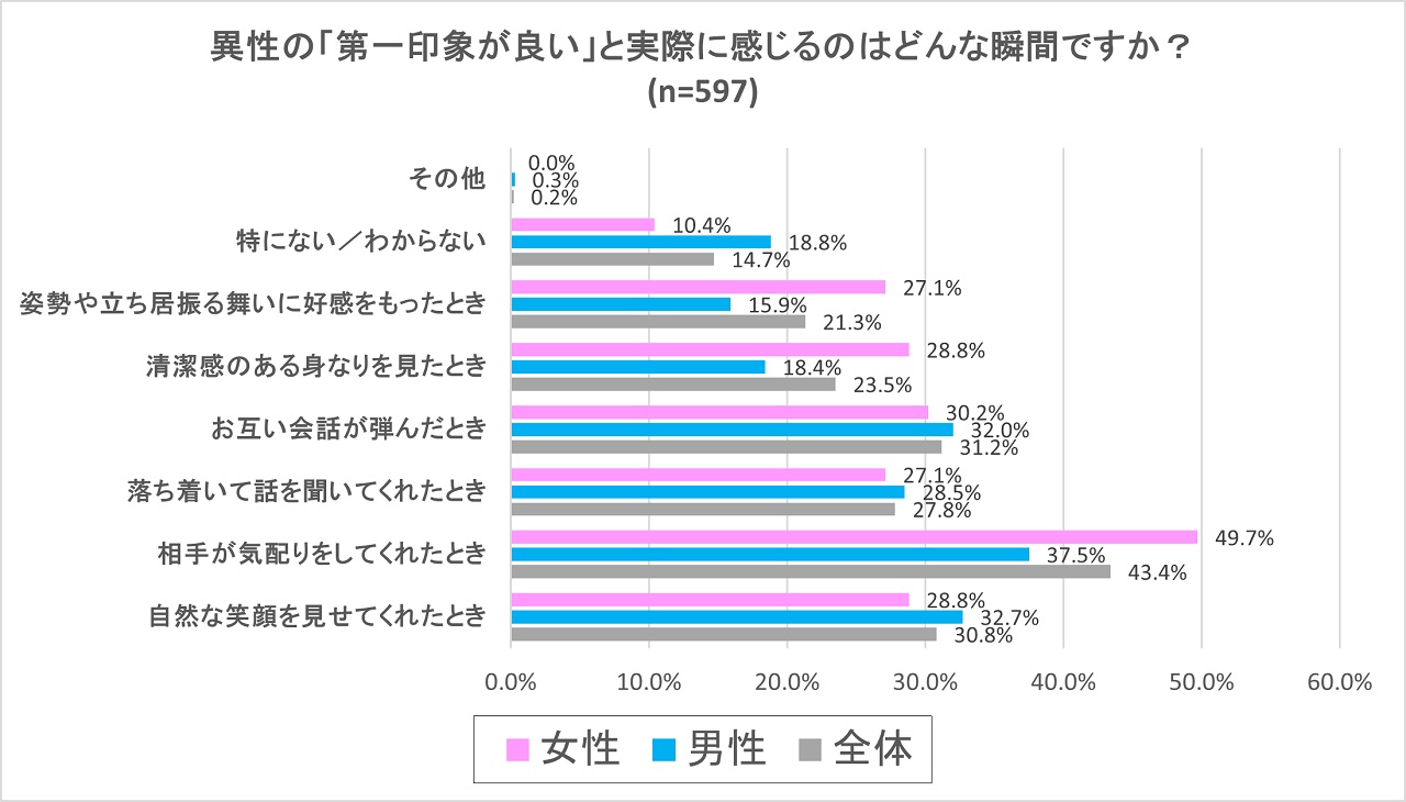 次に「この人、感じがいいな」と思った瞬間について聞いてみると、男女ともにトップは「気配りをしてくれたとき」。相手への思いやりや優しさが伝わる瞬間に、いい印象を持つ人が多いようです。また「会話が弾んだとき」「落ち着いて話を聞いてくれたとき」など、コミュニケーションの心地よさも印象アップのカギに!