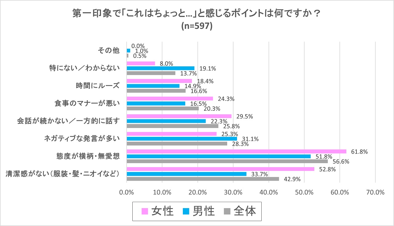 続いて、初対面で「うーん、この人はちょっと…」と感じてしまうポイントについても質問すると、男女ともに「態度が横柄・無愛想」「清潔感がない」が上位にランクイン。どんなに見た目が整っていても、そっけない態度や不機嫌そうな表情ではせっかくの第一印象も台なしになってしまいますね。また、女性は“第一印象で気になるポイント”でも1位に挙がった「清潔感」をより重視する傾向に。服装や髪型、香りなどのちょっとした部分にも清潔感があるかどうかが、好印象かどうかの分かれ目になっているようです。