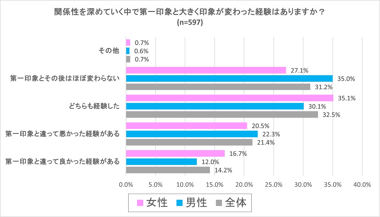 その結果、「第一印象とその後はほぼ変わらない」と答えた人は全体の約3割にとどまり、残りの7割近くが「印象が変わった経験あり」と回答! 第一印象がすべてではなく、その後の関わり方次第で“良い意味でも悪い意味でも”印象は変わっていくようです。