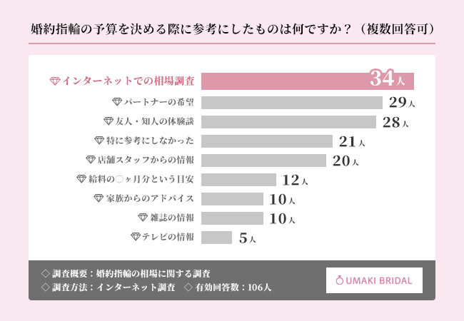 婚約指輪の予算を決めるときに参考にしたもの、最も多かったのは「インターネットでの相場調査」。SNSや口コミサイトで“みんなの平均”をチェックしてから検討する人が多いようです。