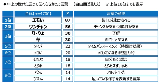 そこで今回は、ジブラルタ生命保険株式会社が20~29歳の男女4,700人(男性2,350人、女性2,350人)を対象に実施したアンケートをもとに、「年上世代に言って意味が伝わらなかった言葉」ランキングを発表します!
