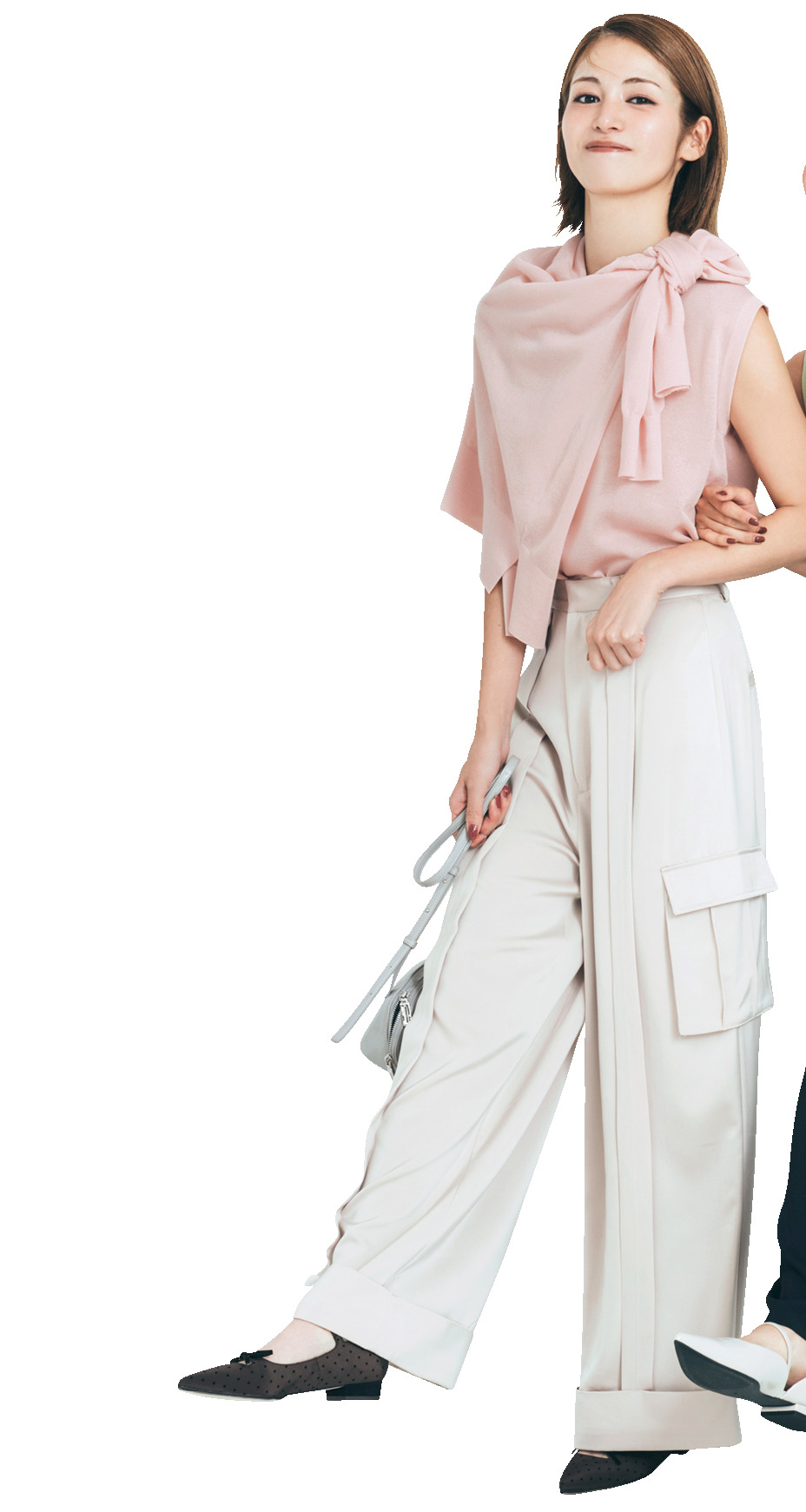 ビッグシルエットのカーディガンを片方の肩に掛け、もう反対側の肩でラフに結ぶだけ。ストール風アレンジで甘めピンクもスタイリッシュにシフト! ボタンは1番上を留めておくとシルエットがくずれにくく、キレイな形をキープできる。