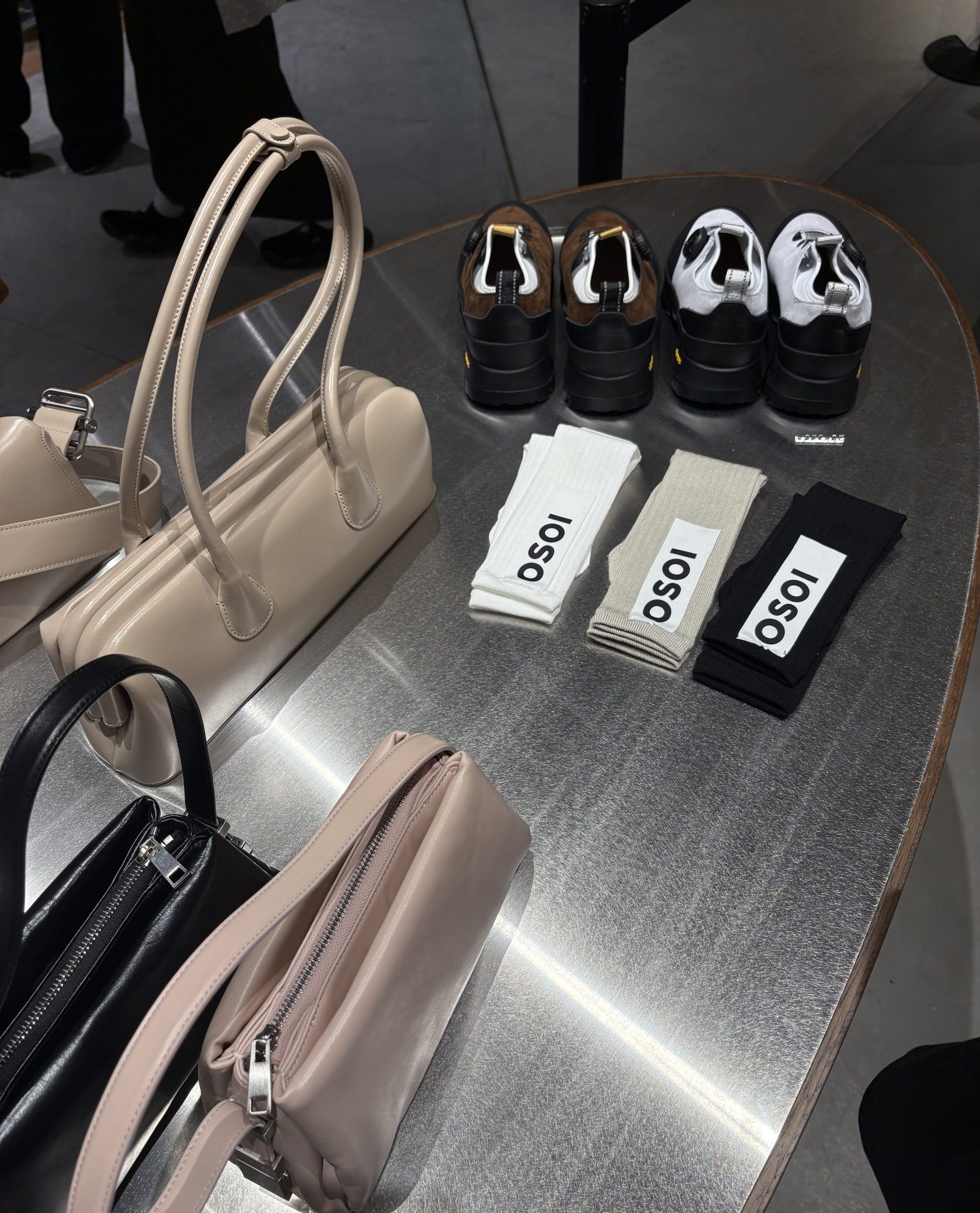店内はシルバーを基調としたモダンな雰囲気。OSOIのバッグのように、曲線を活かしたディスプレイ台が印象的で、洗練された世界観に包まれていました。