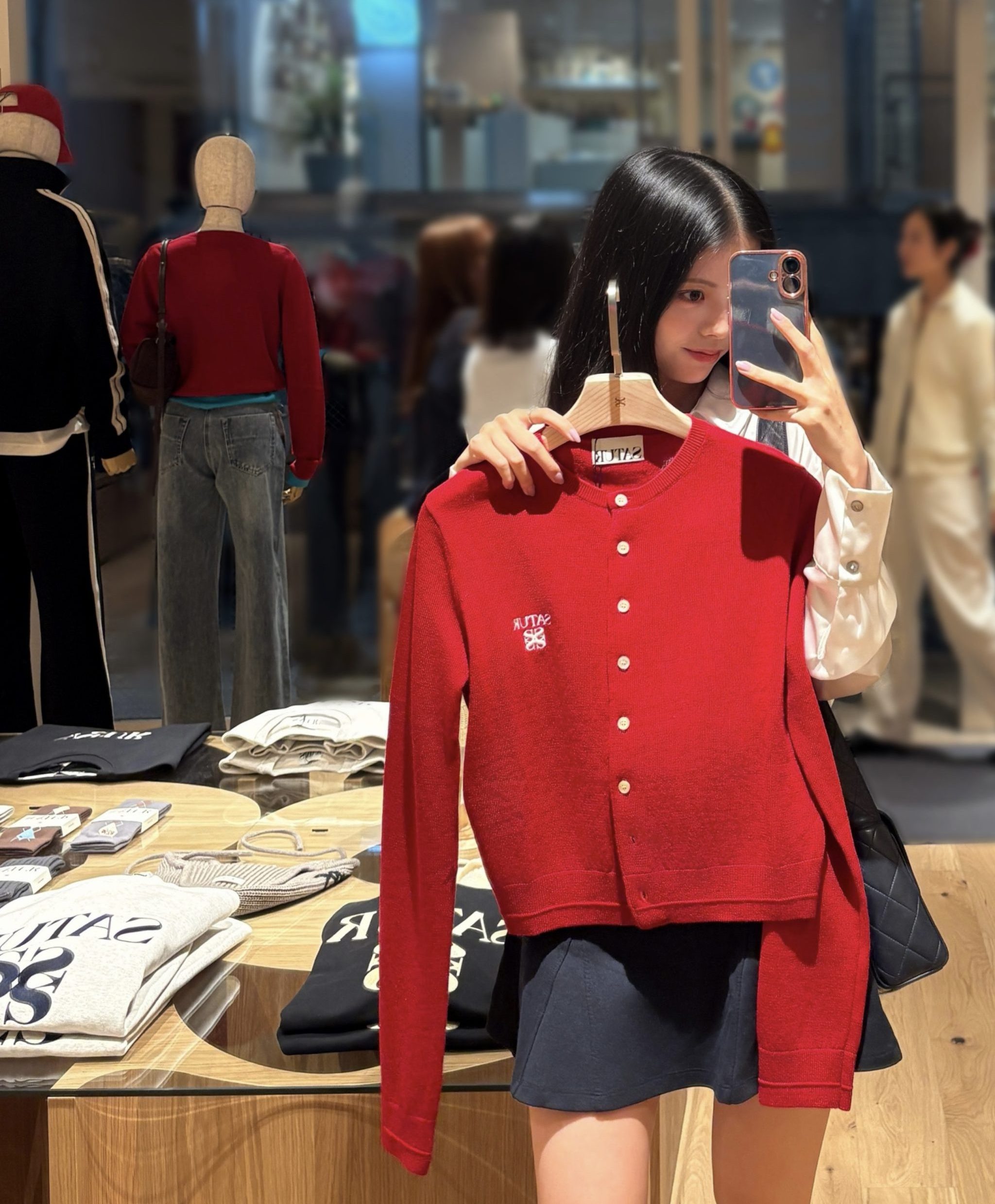 私は赤のカーディガンをゲット!寒くなるとつい暗めの色を選びがちなので、差し色になる明るい赤にしてみました。ショート丈だけど袖は長めで、萌え袖派の私にぴったりのフィット感♡