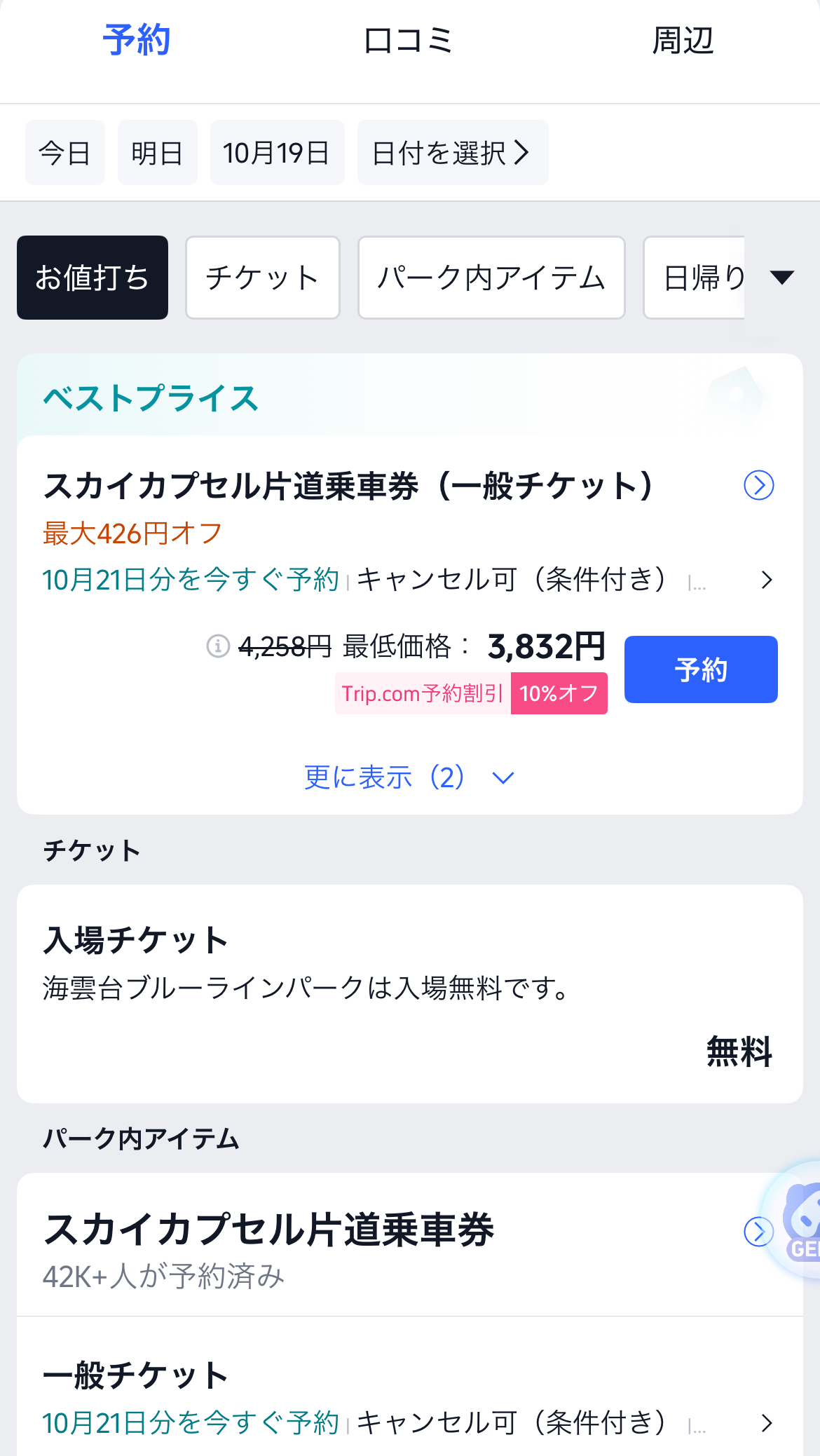 予約の際はこの「予約」と書かれた箇所をタップして、好きな日にちと時間を設定し、チケットを購入するだけ。現地のサイトを確認するよりもずっと簡単で、現地価格と数十円しか変わらない値段で予約できました。