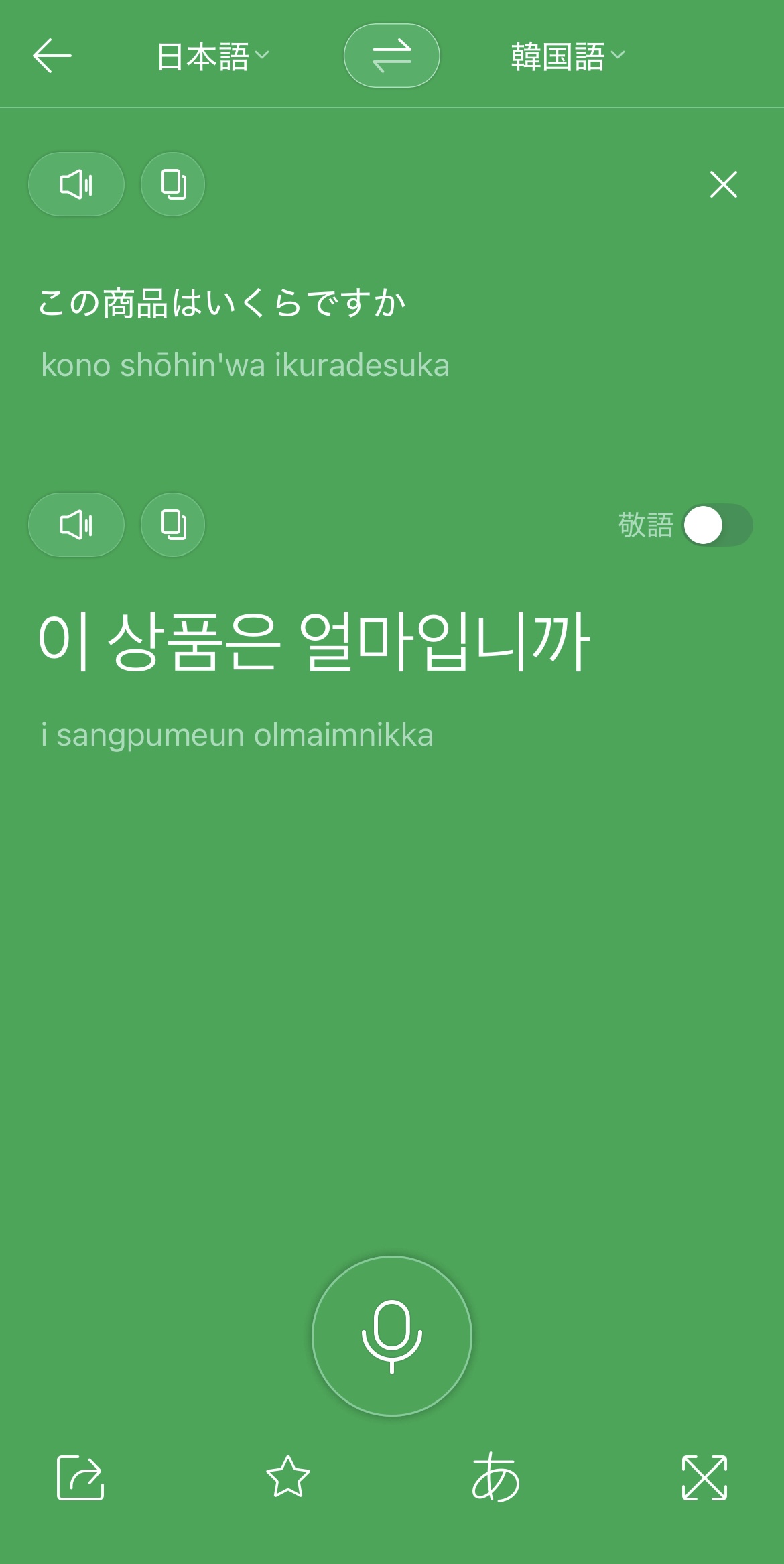 音声では、店員さんに伝えたいことを日本語で話すと韓国語に変換し発声してくれますし、逆も可能。お店やレストランで問い合わせるときに便利でした。「敬語」を押せば、よりかしこまったニュアンスに変えることも可能!