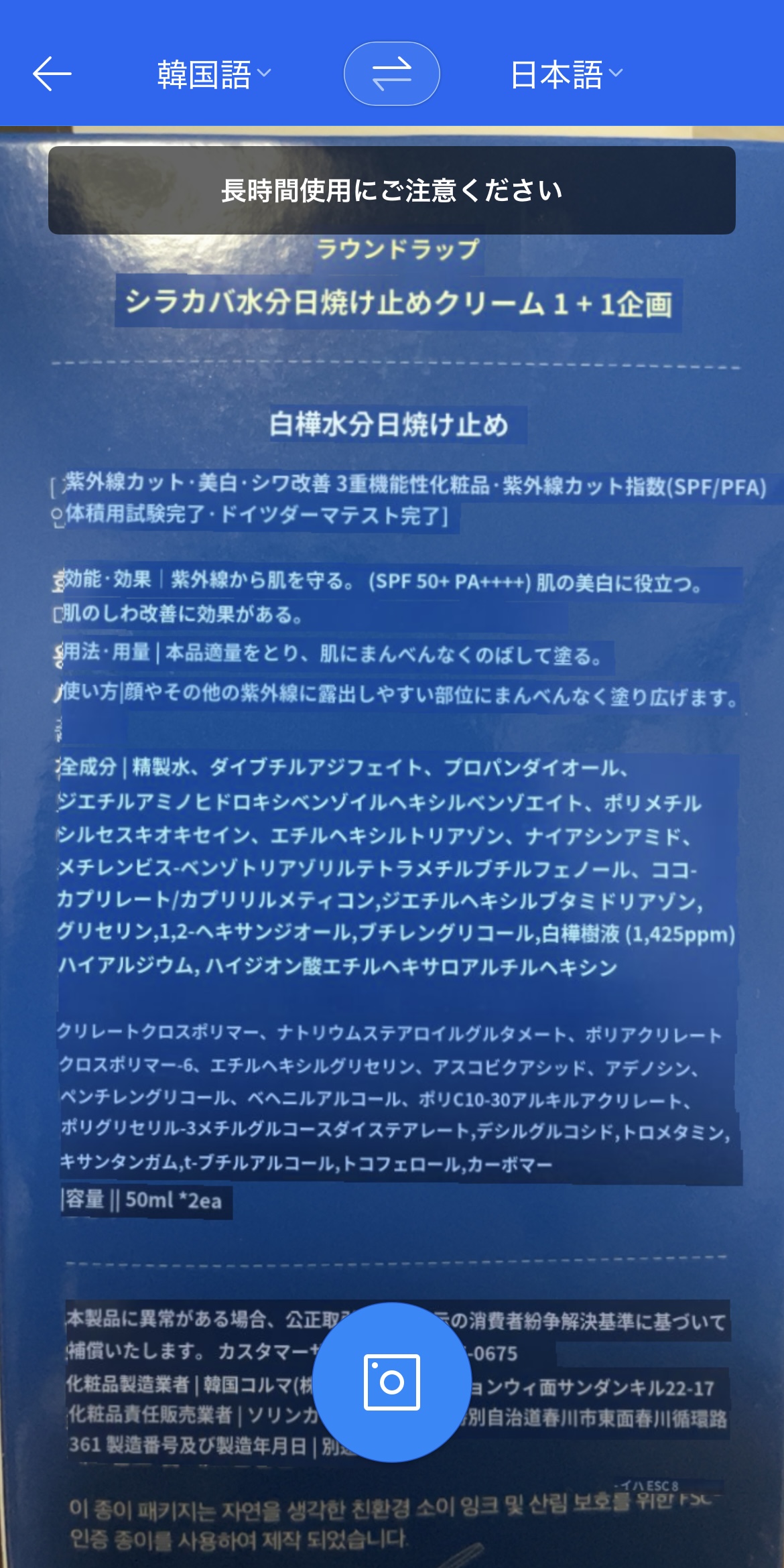 また、画像翻訳ではリアルタイムでカメラをかざして翻訳をしてもらうことも可能。オリーブヤングで初めて見るパケが可愛いコスメを見たときによく使っていました。Google翻訳ほど翻訳スピードは速くないものの、分かりやすい文章で翻訳してくれます。