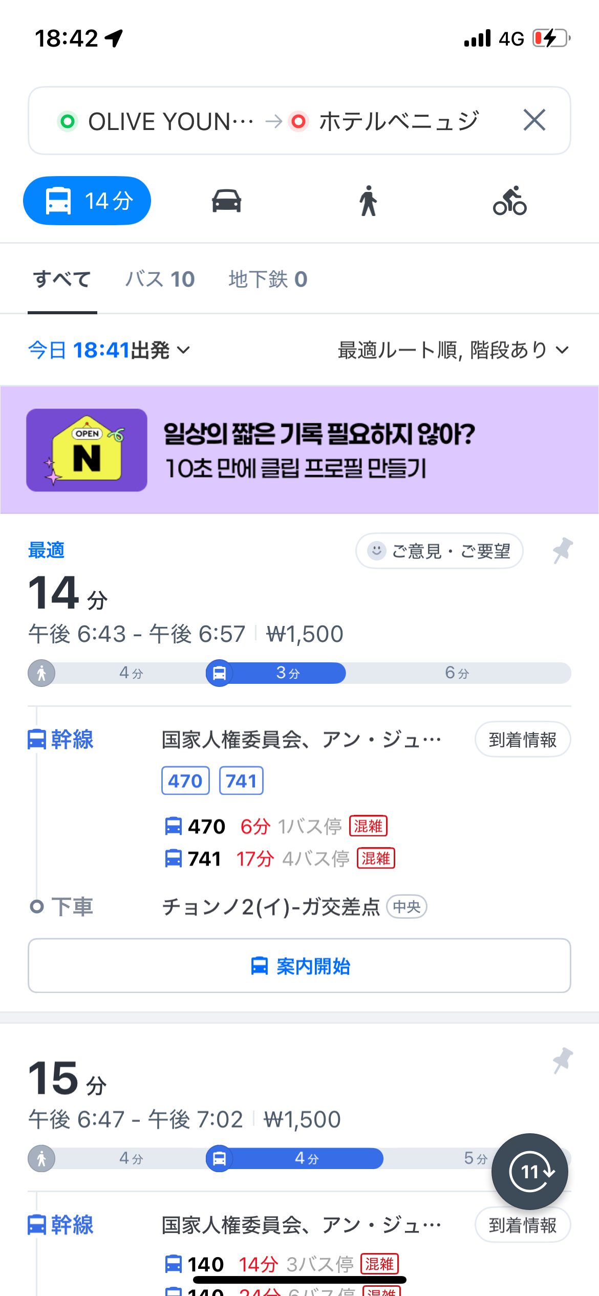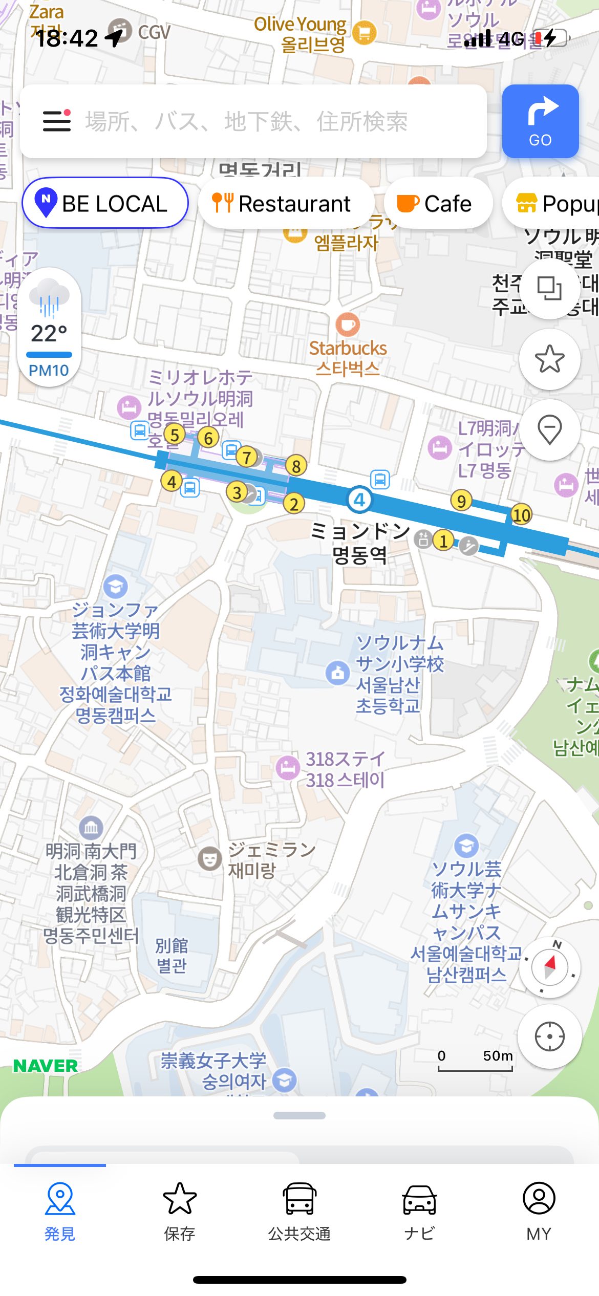 一番にダウンロードすべきなのは、こちらのNAVER MAP。実は、韓国ではGoogle Mapsを開くと検索自体はできるのですが、ルートが表示されず…ナビとしては使えないんです。その代わりに必要なのが、韓国オリジナルの地図アプリ、NAVER MAPです。