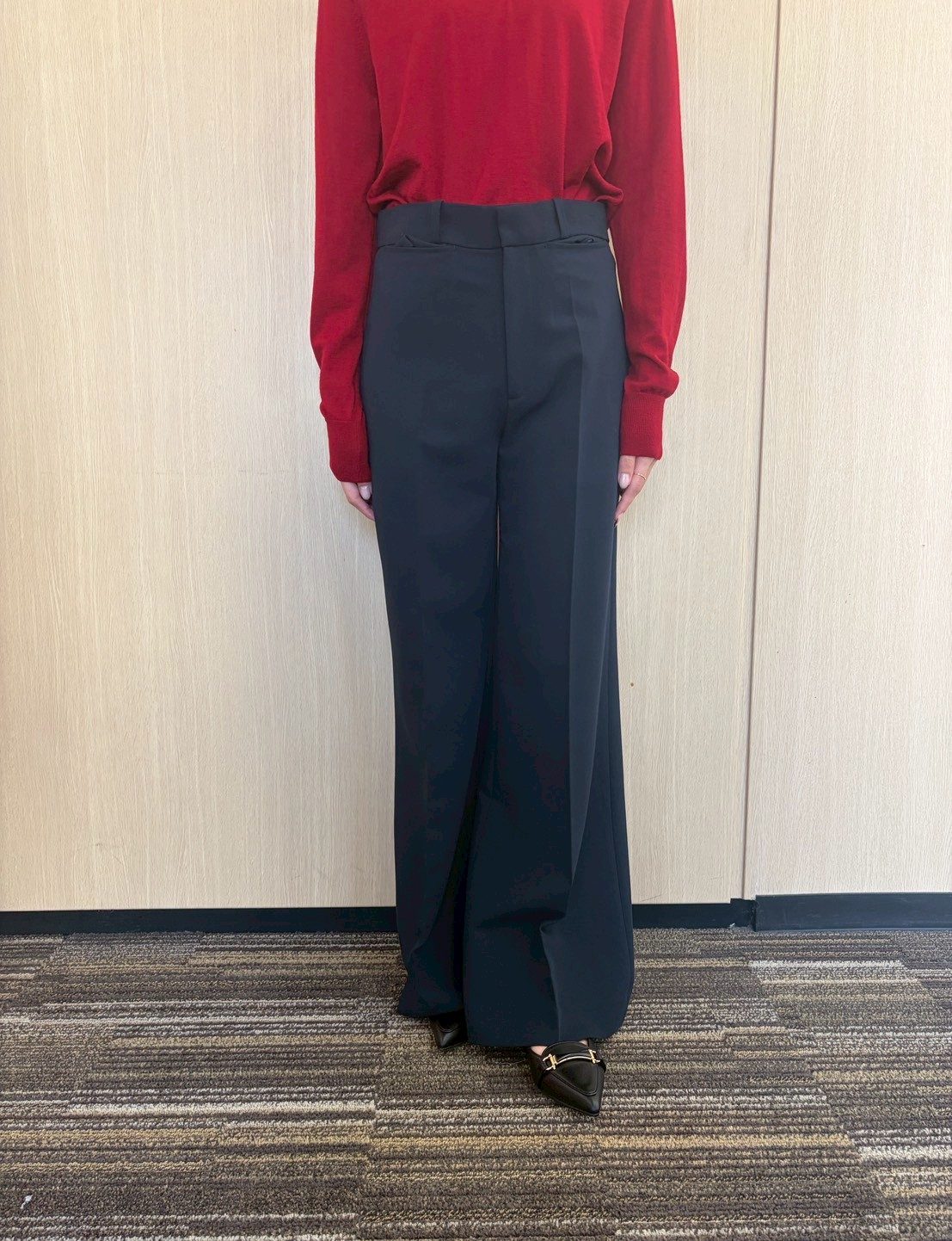 鮮やかな赤ニットとネイビーパンツのフレンチシックな組み合わせ♡ 羽織るだけでサマになるロング丈のトレンチコートを加えると、さらにパリっぽく、上品な雰囲気に。きちんと感があってオフィスにもぴったり。
