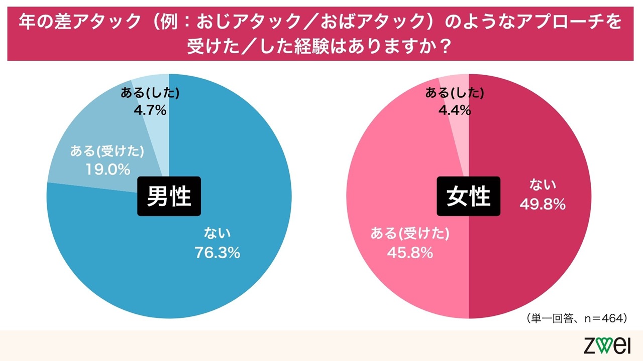 “年の差アタック”の経験がある人は、男性では約2割にとどまりましたが、女性ではなんと約半数が「ある」と回答! 女性の経験者のほとんどは「ある(受けた)」と答えていて、年上からのアプローチを受けたケースが多いようです。