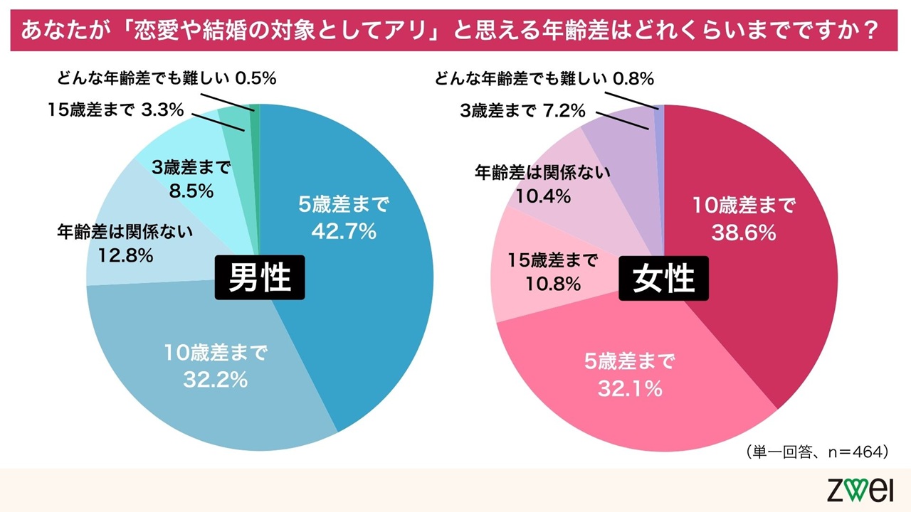 今回は、結婚相談所を運営する株式会社ZWEIが18歳以上の独身男女464人(男性211人/女性249人/無回答4人)を対象におこなったアンケートをもとに、「年の差恋愛」および「年上からのアプローチ」にまつわる世間のリアルな声をご紹介します。