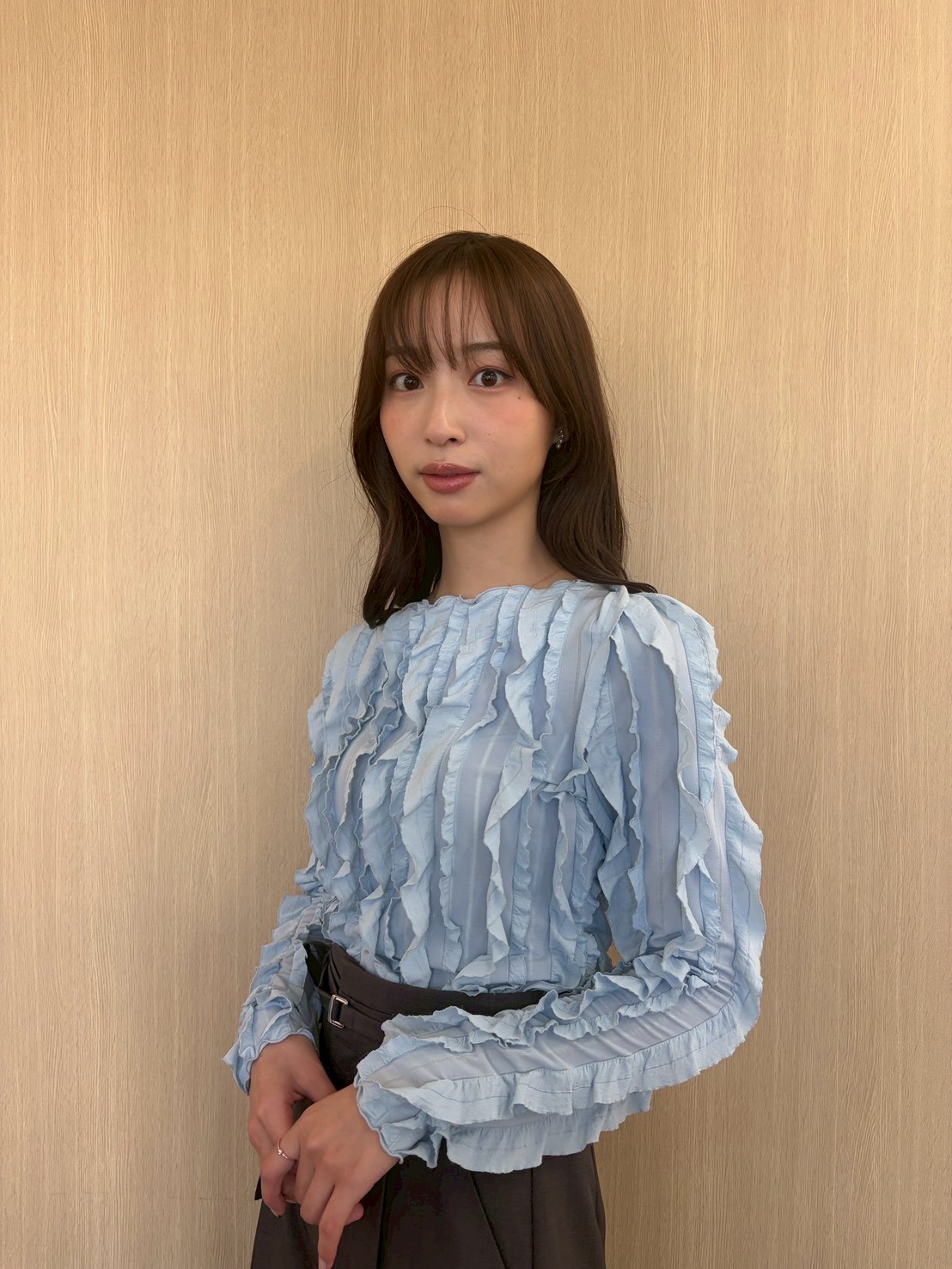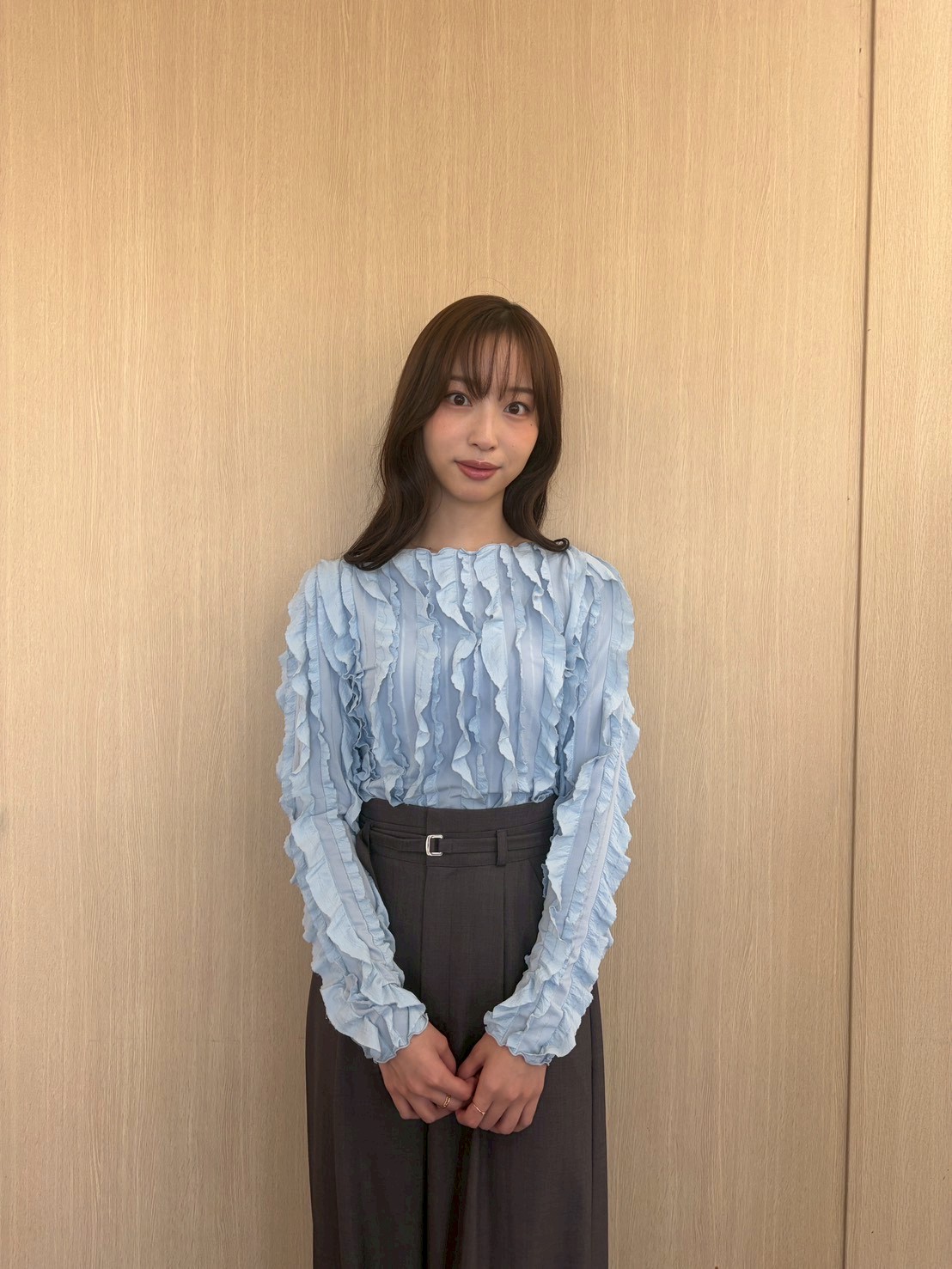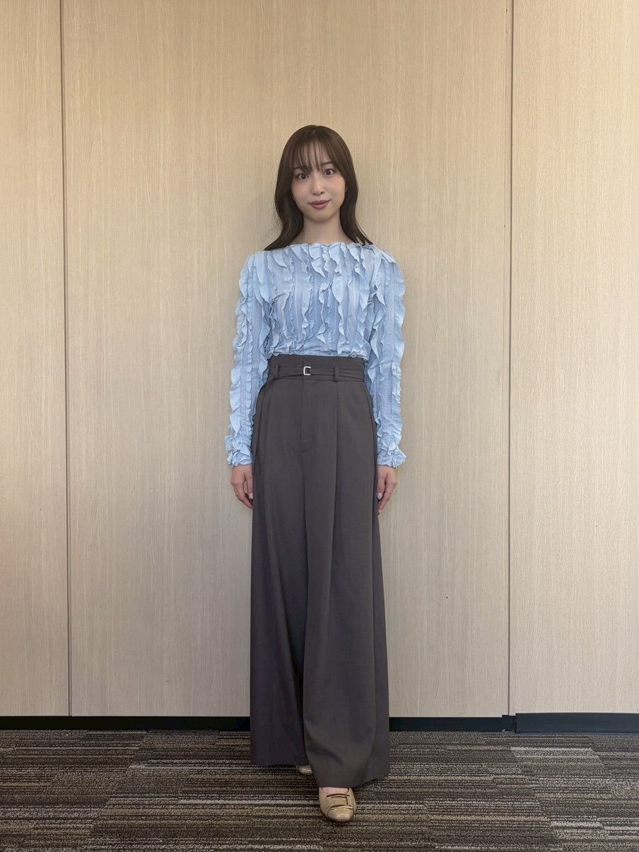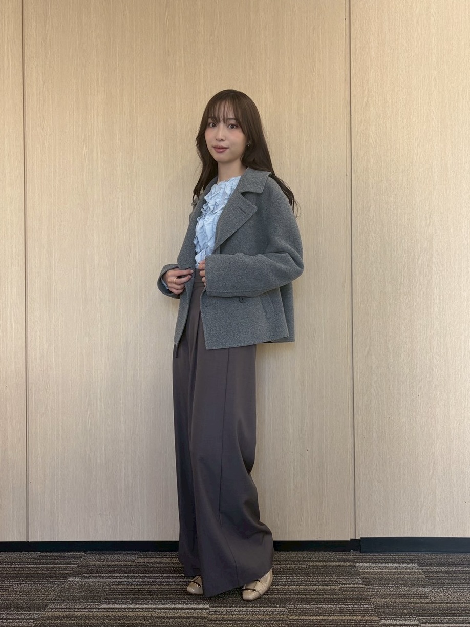 1週間の真ん中水曜日のやる気を底上げする、爽やかなパステルブルーのブラウス。たっぷりのフリルにテンションもUP! 端正なグレーパンツ&コートでスタイリッシュに着こなして、きちんと感のあるお仕事スタイルに。