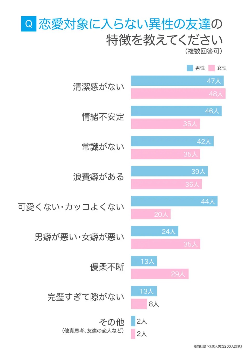 恋愛対象に入らない異性の友達の特徴を聞いたところ、「清潔感がない」と「情緒不安定」が上位にランクイン。恋愛において、多くの人がこの2つの要素を重視しているんですね。また、「常識がない」や「浪費癖がある」も恋愛対象から外れる確率UP!