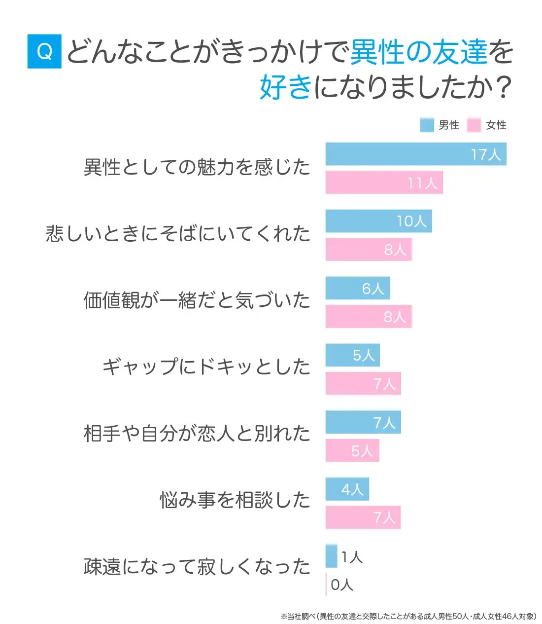 異性の友達と交際経験のある成人男女96人に、好きになったきっかけを質問。すると、そのきっかけは非常にさまざまなことがわかりました! 特に、男性とっては「異性としての魅力を感じた」が、2番目の「悲しい時にそばにいてくれた」に大きく差をつけて1位になったのに対し、女性はどの回答も、割合が拮抗しています。
