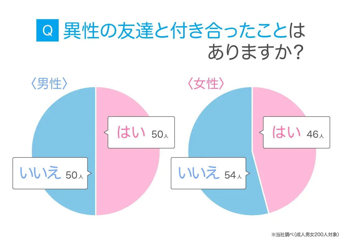 異性の友達と付き合ったことがあるかという質問では、約半数の人が「はい」と回答! 「友達から好きになったことがあるか」という問いの回答からは少し割合が低くなるものの、やっぱり友人から恋人になる流れは比較的自然と言えます。そもそも異性の友人は、人として好意を持っている相手。きっかけがあれば、恋愛に発展する可能性は十分に秘めています♡