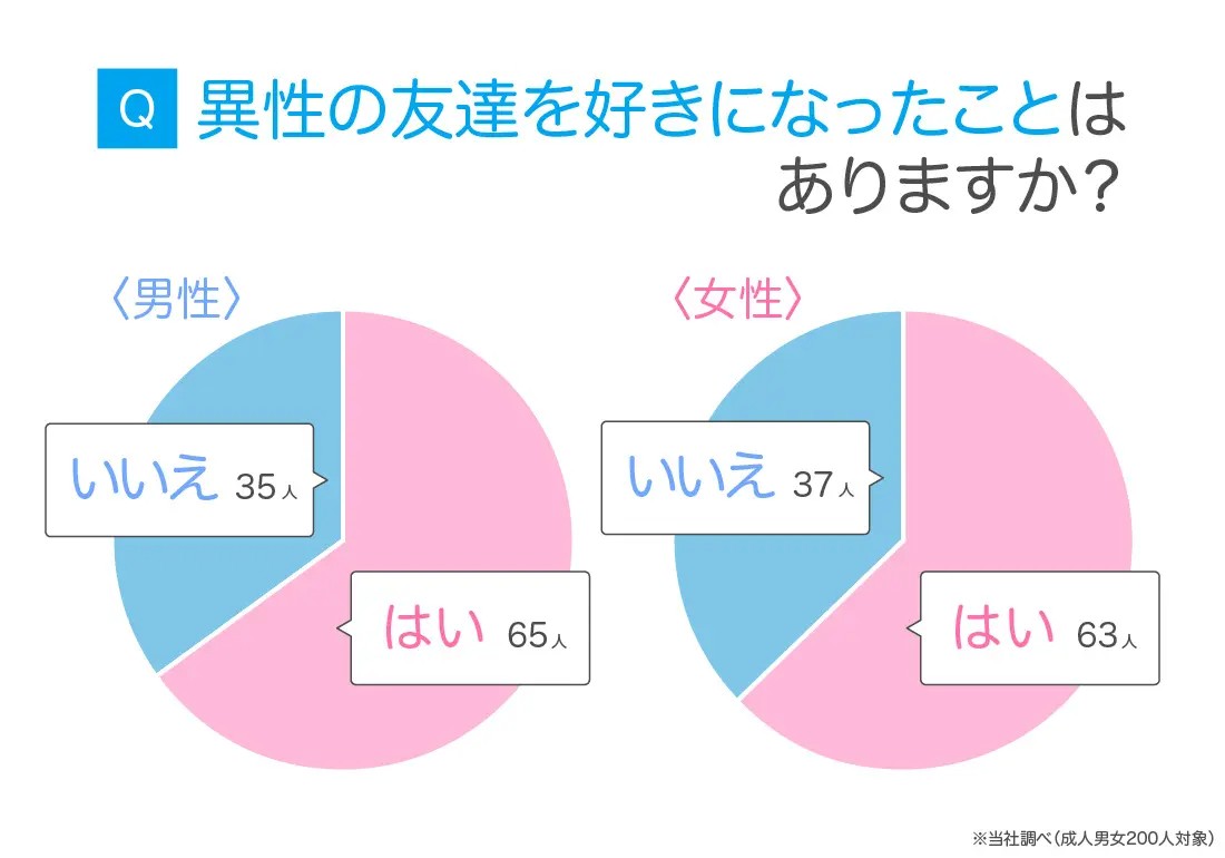 なんと、異性の友達を好きになったことがあるという方は約6割と、半数を超えました! 男女間の差は二人なので、性別による違いはないとみていいでしょう。友情から恋愛に変わること自体は、結構自然なことのよう。「男女の友情は成立する?」という疑問が永遠に持ち上がるのも無理はないかも…!