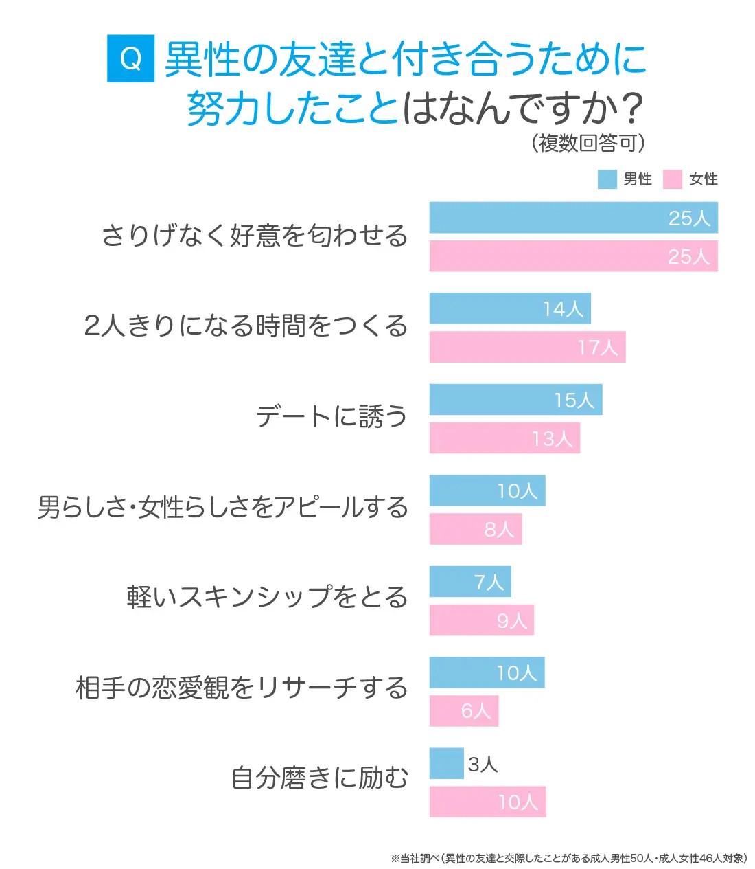 異性の友達と交際経験がある回答者に、“付き合うために努力したこと”を聞いたところ、「さりげなく好意を匂わせる」が最多回答となりました! 男女ともに全体の約半数を占めています。次に多かったのは、「2人きりになる時間をつくる」「デートに誘う」という回答。突然恋愛モードに切り替えても相手を混乱させかねないので、ゆっくりと関係性を変化させていくようにしている人が多いようですね!