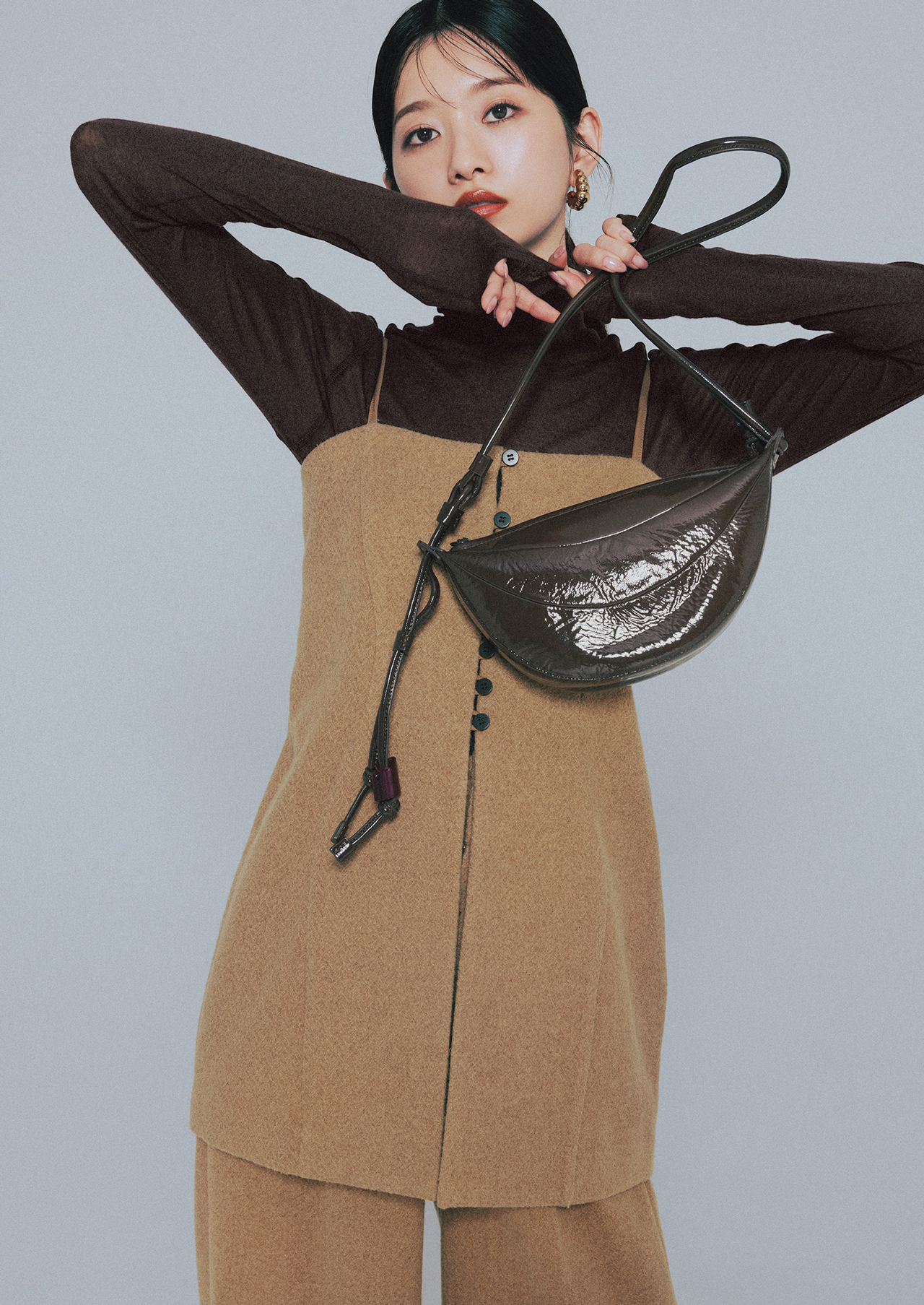 間違いなくかわいいブラウン×キャメルの組み合わせ♡ シアーなタートルにウールのセットアップ、光沢バッグで質感に差をつければ、同色の中にリズムが生まれてさらにこなれたスタイリングが叶う!