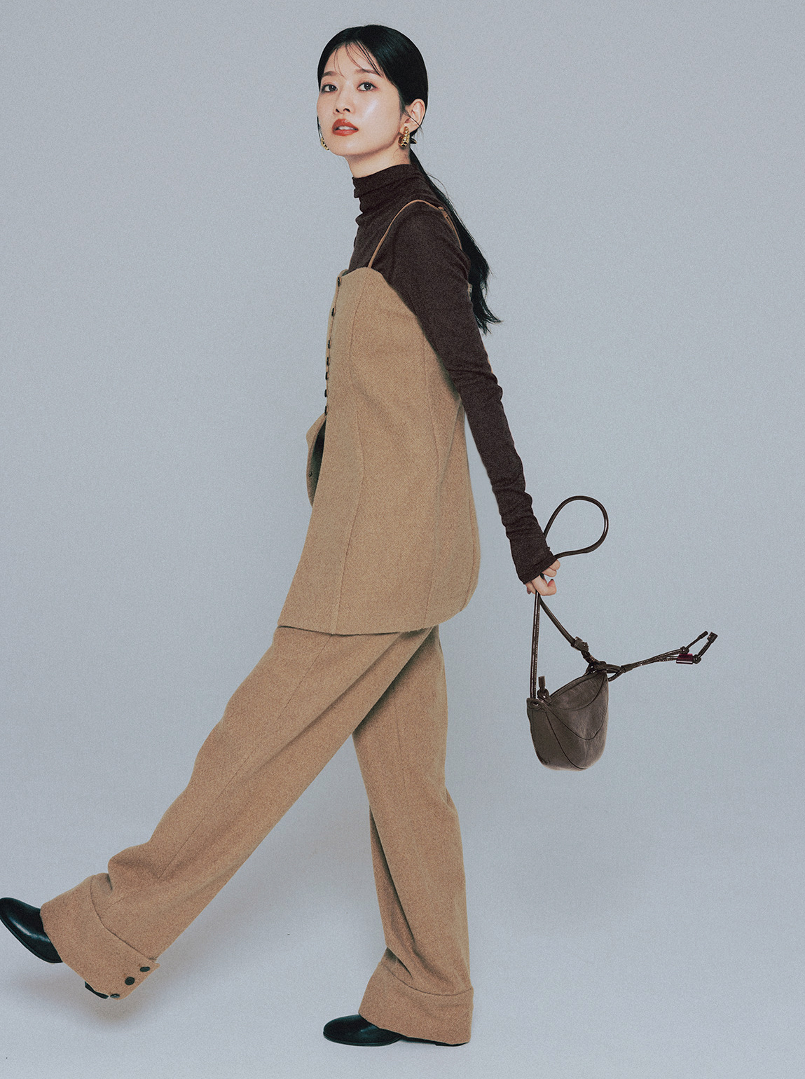 キャメルのビスチェ×パンツにブラウンのカットソーをレイヤードしたグラデ配色で、奥行きのある着こなしに。絶妙な丈感のビスチェなら、着回し力も◎!