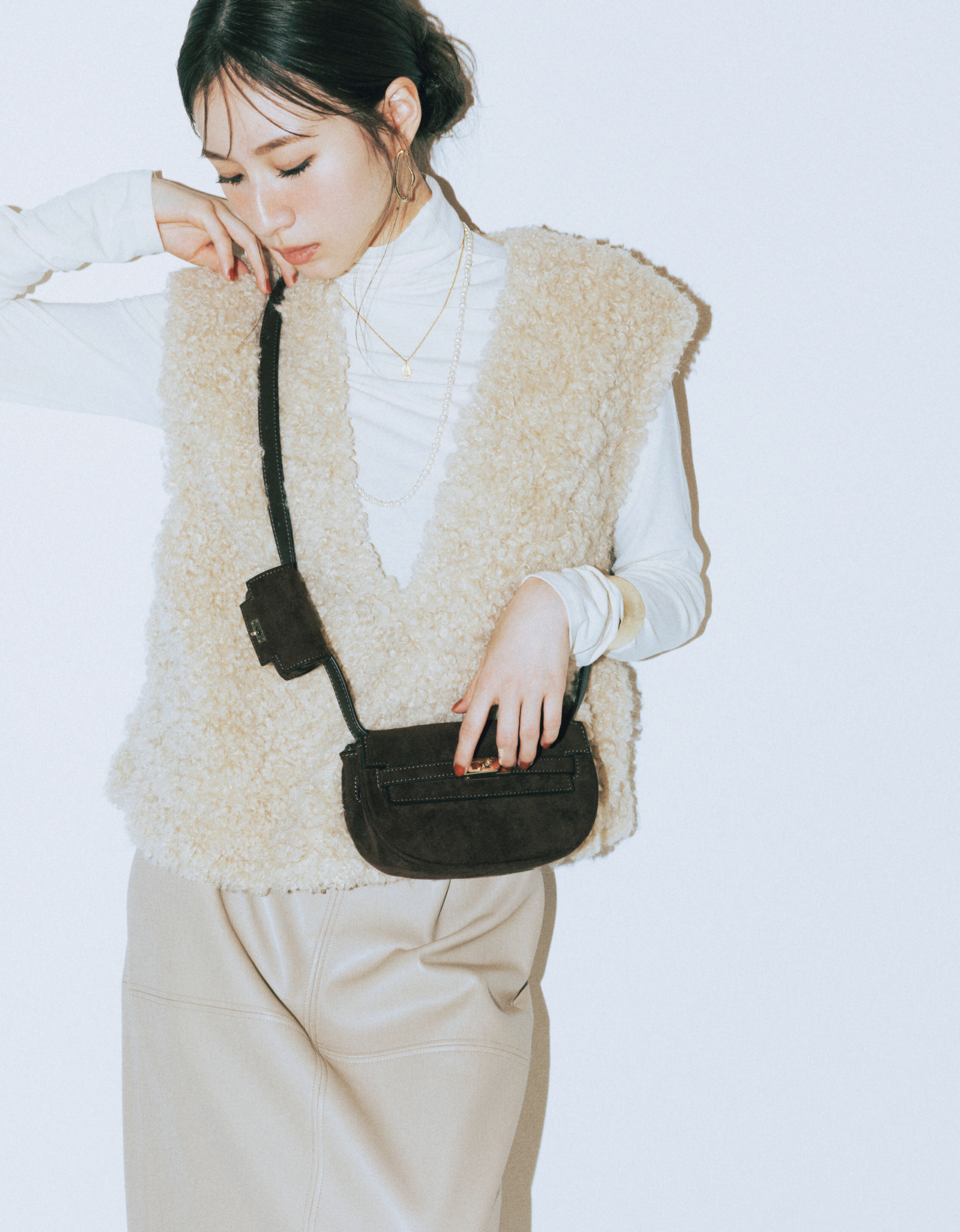 ファーベストが主役のレイヤードにキレのいいレザー風スカートのツヤ感で、感度高めの着こなしに。存在感のある素材同士も、淡色のワントーンでニュアンシーにまとめることで品よく仕上がります。斜めがけしたバッグで、引き締め効果を発揮。