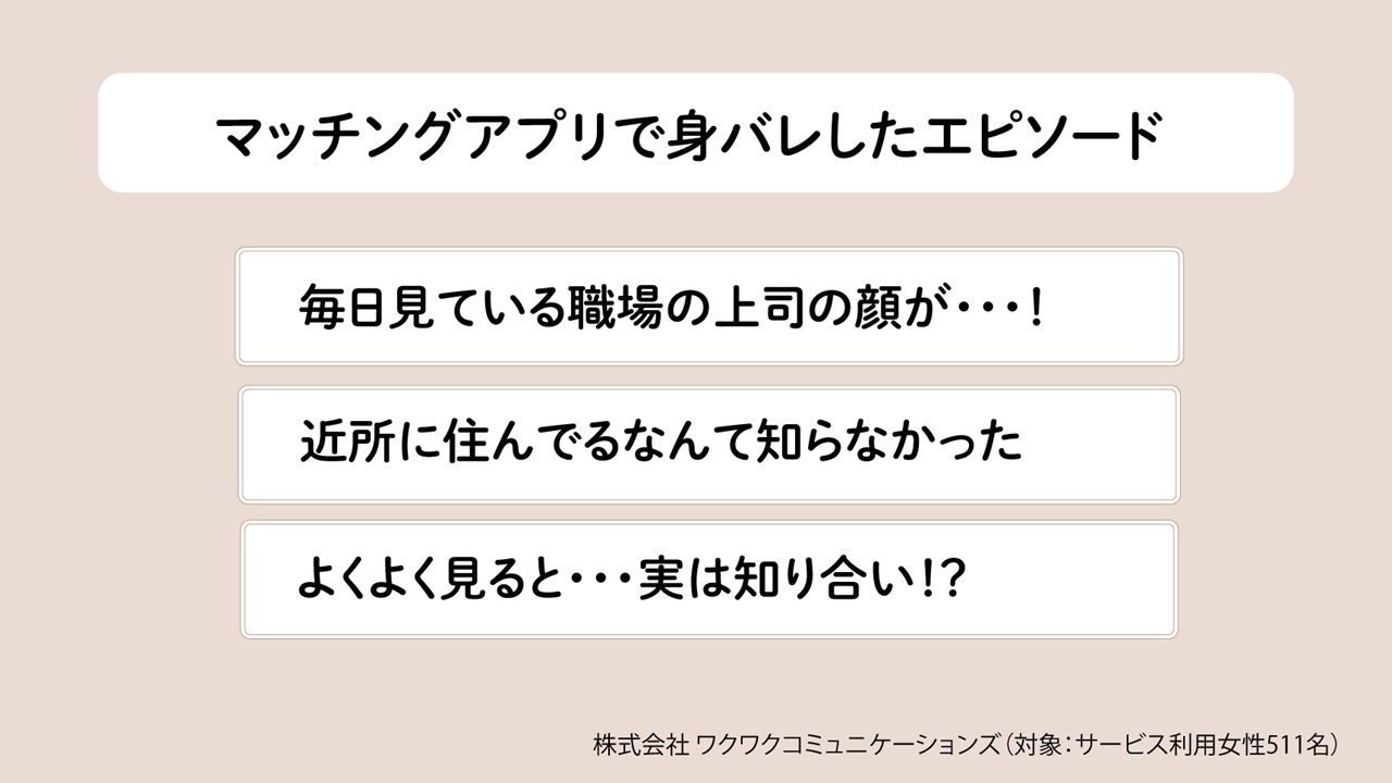そこで今回は、日本最大級の恋愛マッチングサービス「ワクワクメール」が女性511人を対象に実施したアンケートをもとに、マチアプでのリアルな「身バレあるある」から対策までをご紹介します。