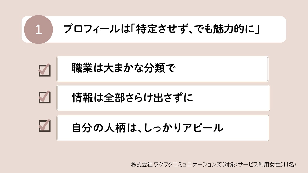 プロフィールに入れる内容は、個人情報を守りつつ人柄を伝えることが大切。成功者たちは、仕事の詳しい内容や肩書きを避けつつも、趣味や価値観を丁寧に書いて「話してみたい」と思わせるプロフィールを作っていました。