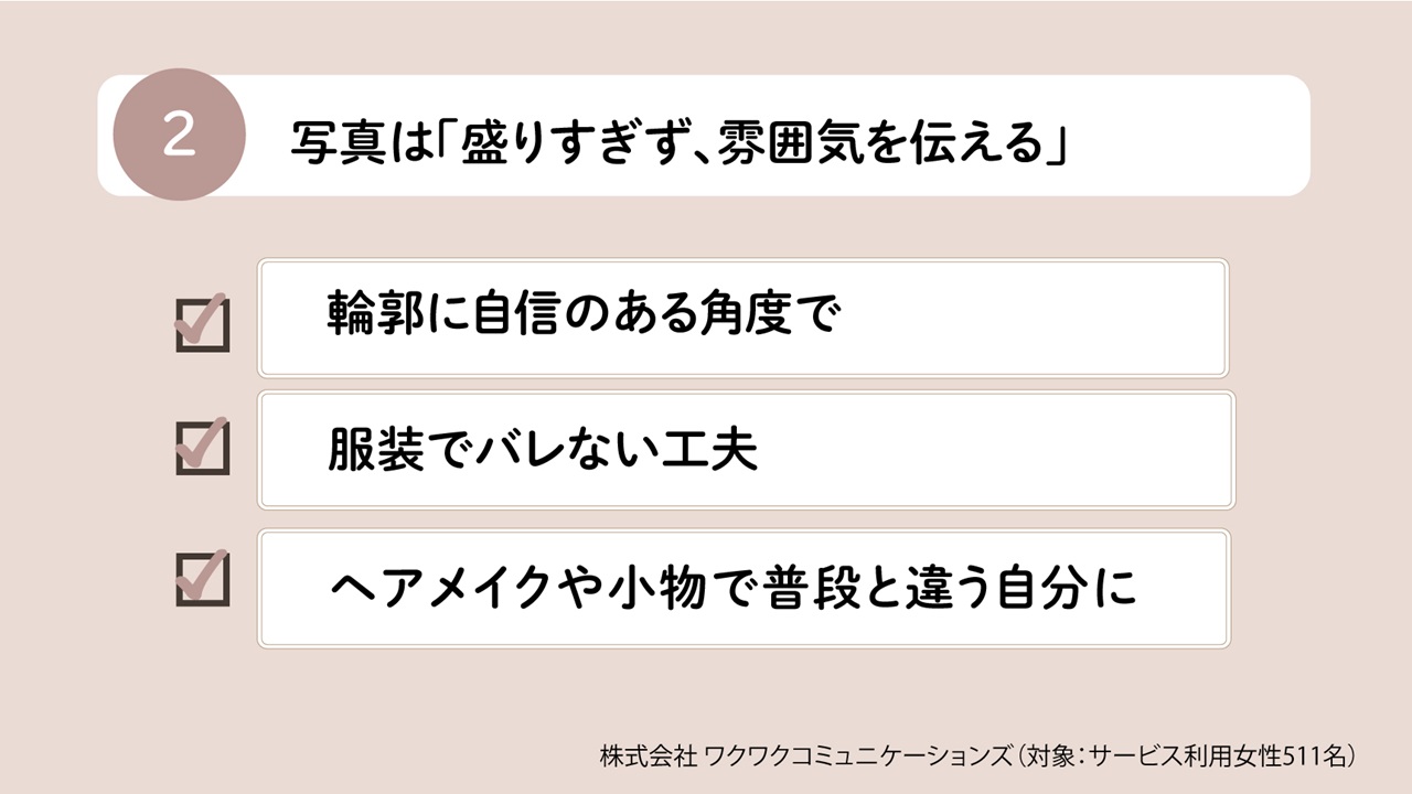 写真は、自分をよく見せたい気持ちとリアルさのバランスがポイント。成功している人は真正面からの写真ではなく、“自分の魅力を感じられる角度&少し引きの写真”を選んでいました。ウィッグはハードルが高めですが、ファッション小物やヘアメイクで普段と雰囲気を変えてみる方法も!