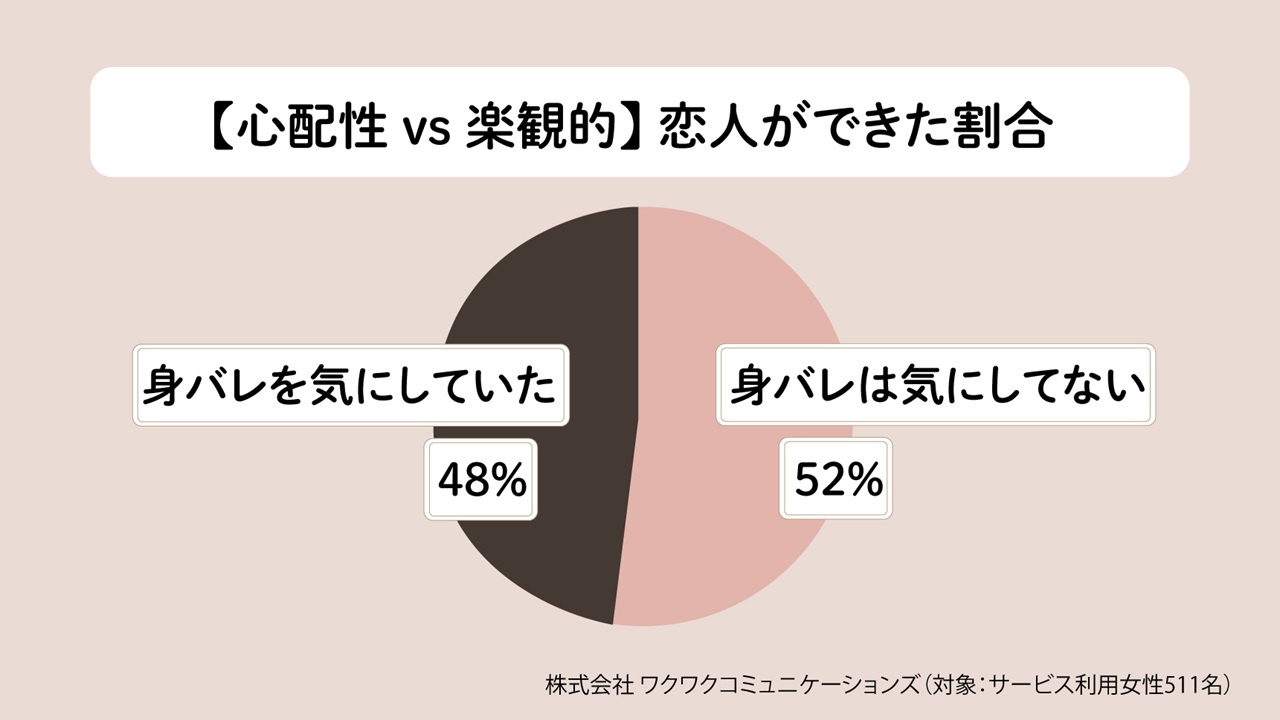 今回の調査では、「身バレがとても不安/少し不安だった」と回答した方の中で恋人ができた割合は約48%。一方、「あまり/全く不安はなかった」と回答した方では約52%と、両者に大きな違いは見られませんでした。