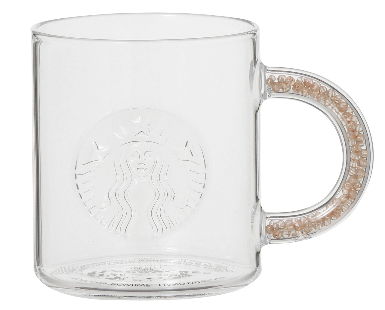 星を立体的に表現したガラスチャームと星型コンフェッティが内側にデザインされたダブルウォール耐熱グラス。サイレンロゴを中心に配したスターバックスらしいカップを思わせるデザインと、ゴールドの星がホリデー気分を高めてくれること間違いなし!
