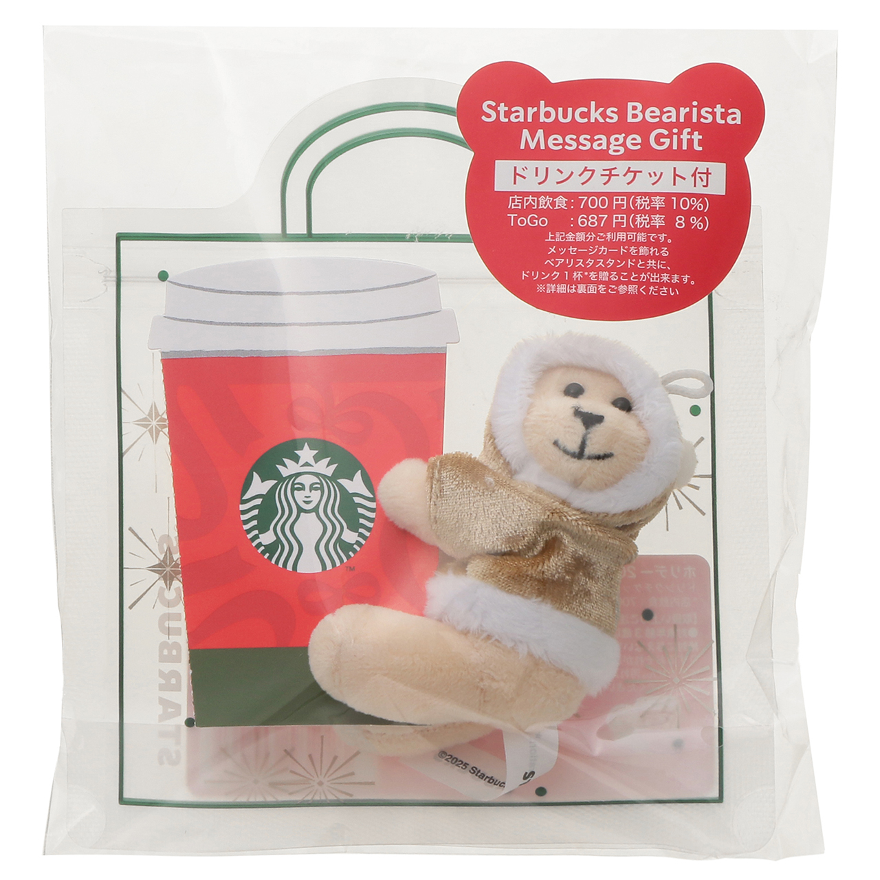 ドリンクチケットが付いたメッセージカードをベアリスタスタンドにセットして、ジップバッグに入れて、贈ることができるギフト商品。シャンパンゴールドの衣装を身にまとったベアリスタが、冬の訪れを楽しみにさせてくれる!