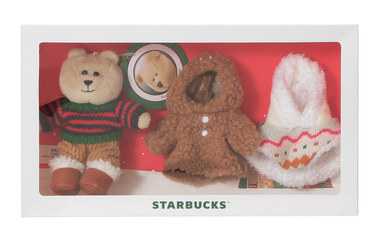 冬らしいニットを着たベアリスタに着脱可能なアウターが2種類セットになったボックス入りベアリスタMiniセット。一つはジンジャーブレッドマンをイメージしたボアジャケット、もう一つは暖かみのあるニットケープです。クリップパーツがついており、バッグなどに取り付け可能。その日の気分に合わせて、着せ替えできるのが嬉しい!