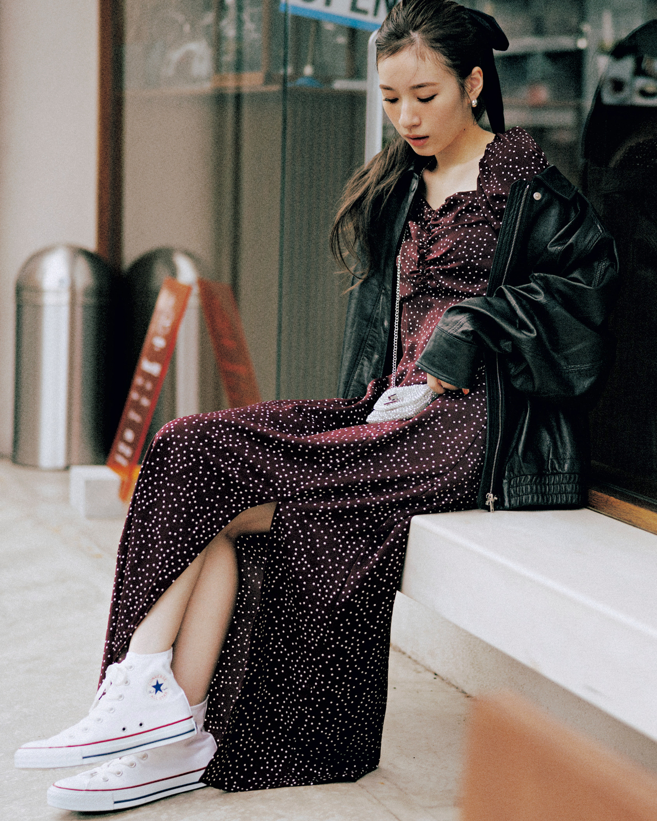 色褪せたブラックレザーとバーガンディのドット柄でヴィンテージムード増し増しが旬♡ 胸元のギャザーディテールや裾スリットでレディな雰囲気のワンピは、軽やかな白スニーカーで程よくカジュアルダウン。