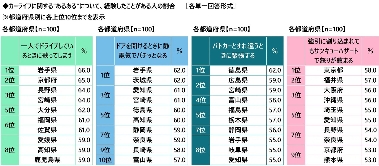まずは「一人でドライブしているときに歌ってしまう」人が多い都道府県! 一位は岩手県でした。さらに、「ドアを開けるときに静電気でバチッとなる」でも62.0%で岩手県が一位。茨城県も同率です。