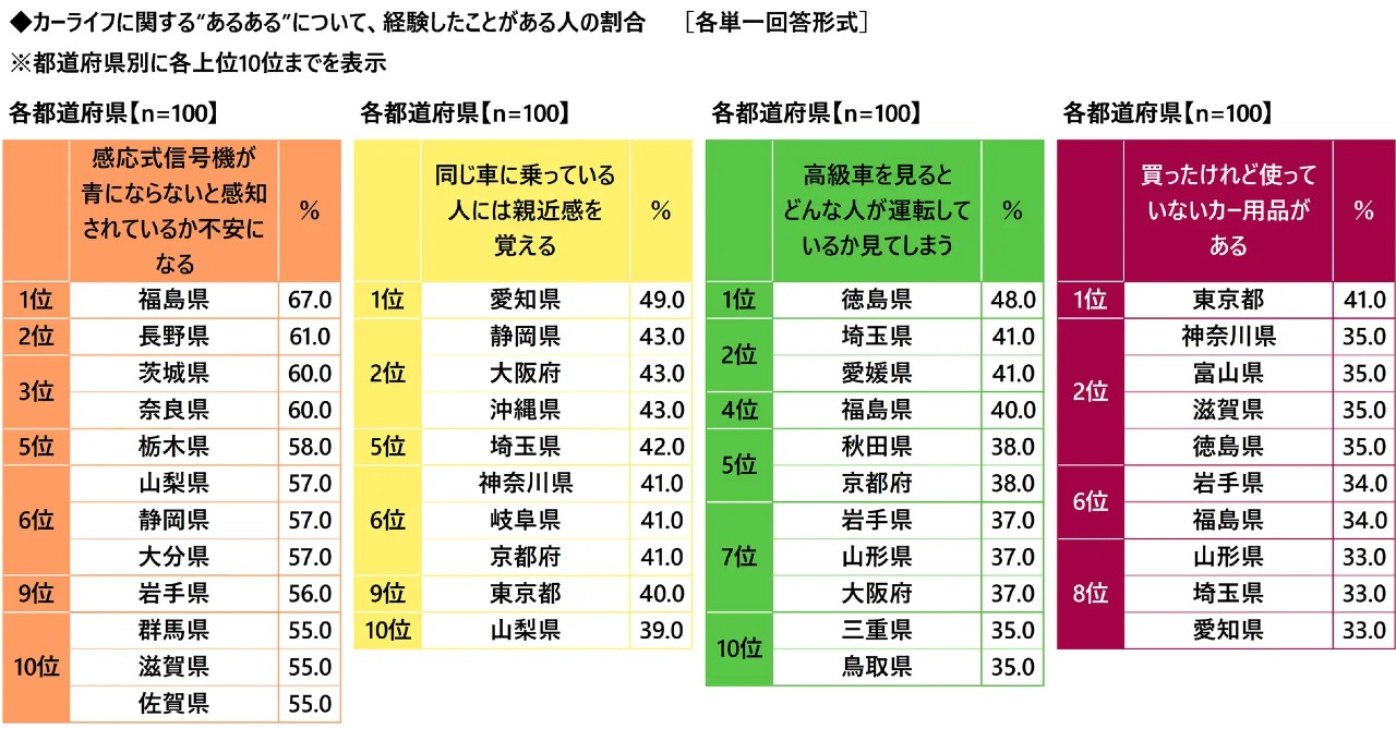 「感応式信号機が青にならないと感知されているか不安になる」では福島県(67.0%)で、中心部には設置が少ない点も関連して地方に集中する結果に。「同じ車に乗っている人には親近感を覚える」では愛知県(49.0%)となり、関東・中部・近畿に集中しました。「高級車を見るとどんな人が運転しているか見てしまう」では徳島県(48.0%)ですが、東北が3県ランクインしていたりと、地方が多め。「買ったけれど使っていないカー用品がある」では東京都(41.0%)がランキングトップでした!