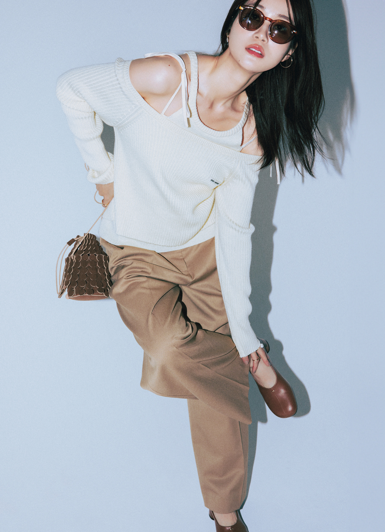 ニット¥16,500・中に着たタンクトップ¥15,400(ハニーミーハニー)、パンツ[共布ベルト付き]¥24,200(デミルクス ビームス 新宿<デミルクス ビームス>)、バッグ¥33,000(Al Design<MARY AL TERNA>)、靴¥17,600(ダイアナ 銀座本店<ダイアナ>)、サングラス¥48,400(アイヴァン 東京ギャラリー<アイヴァン>)、イヤリング¥2,090(アネモネ/サンポークリエイト)、リング[右手]¥15,950(パンドラ)・[左手人さし指]¥36,300(ブルーム)・[左手中指]¥11,000(シトラリー)