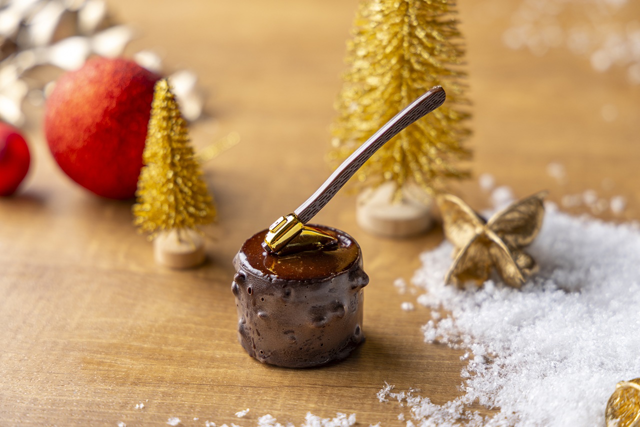 濃厚なチョコレートムースに、キュートなサンタクロースの工房をイメージしたチョコレートを添えてご提供。目の前で粉砂糖をふりかけ仕上げる演出を楽しめちゃう!