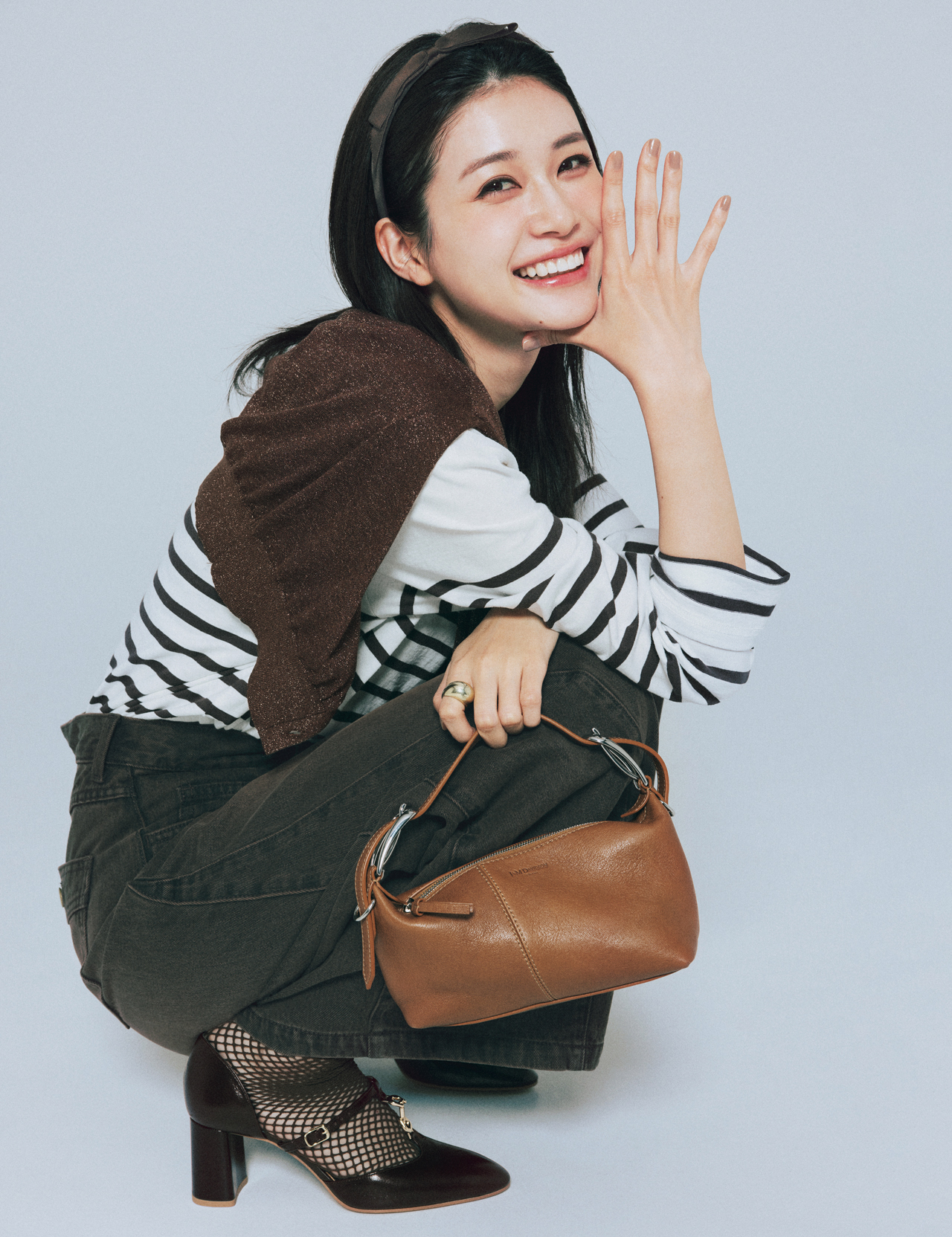 カットソー¥19,800(ゲストリスト<ルミノア>)、パンツ¥17,930(LILY BROWN ルミネエスト新宿店<リリー ブラウン>)、肩に巻いたカーディガン¥12,650(マイストラーダ)、バッグ¥121,000(J&M デヴィッドソン <J&M DAVIDSON>)、靴¥20,350(ダイアナ 銀座本店<ダイアナ>)、靴下¥935(タビオ<靴下屋>)、カチューシャ¥17,600(THE HAIR BAR TOKYO<THE HAIR BAR TOKYO>)、リング¥17,600(アルティーダ ウード)