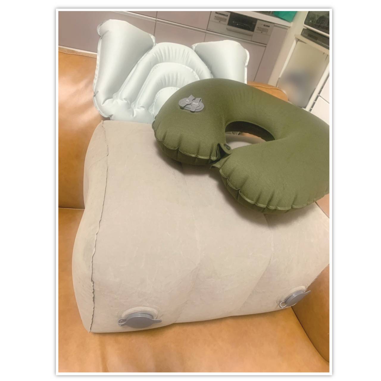 足がむくんで痛くならないようにする着圧タイツや快適な眠りを誘うアイマスク、足をのばせるクッション、腰を痛めないクッション、首を痛めないクッション。