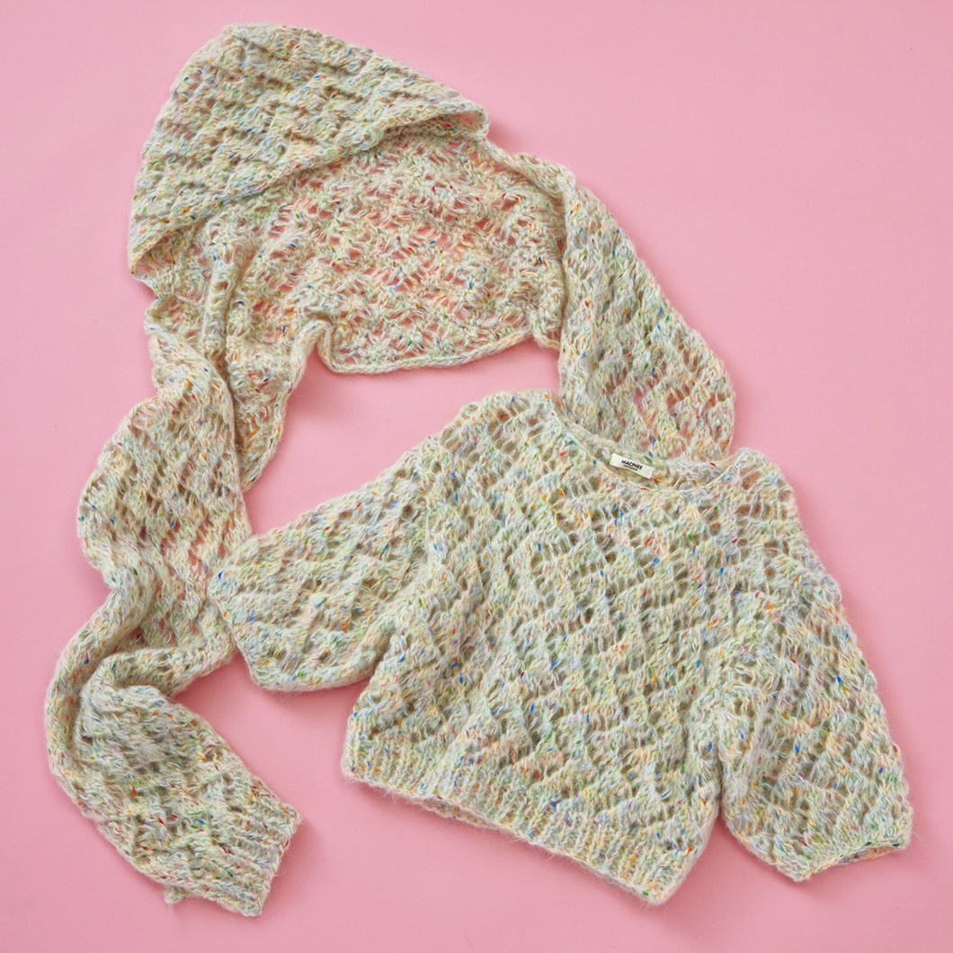 「今季の気分にヒットしたのが、表情豊かな色使いと、ゆるっと編まれたハンドメイドならではの温もりが魅力のミックスカラーニット。ボリューミーなストールはバラクラバデザインになっていて、さらにきゅんとするかわいさです」(ライター 岩附永子)