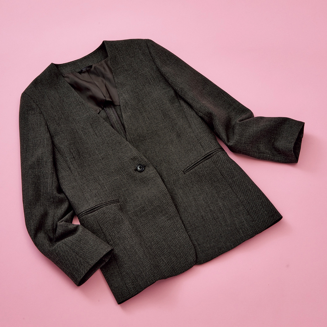 「洋服の青山で見つけたジャケットは、カジュアルにもきれいめにもいける今っぽブラウンが推し! この端正な佇まいで、自宅で洗えるってすごくないですか? ストレッチのきいた素材なので、中にニットを着てもストレスフリー」(デスク 権藤彩子)